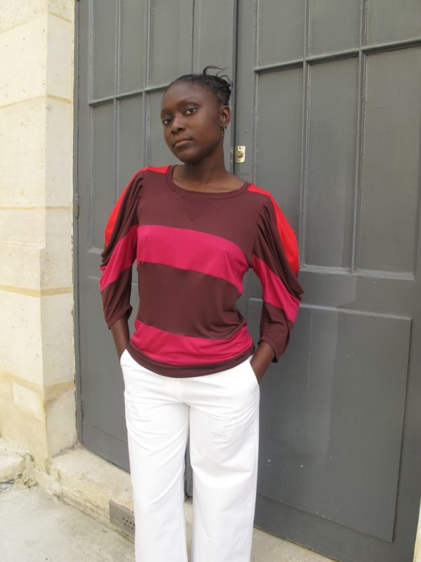 Multi color soft jersey top with cut and sew stripes and large pleated sleeves with statement drape style.