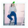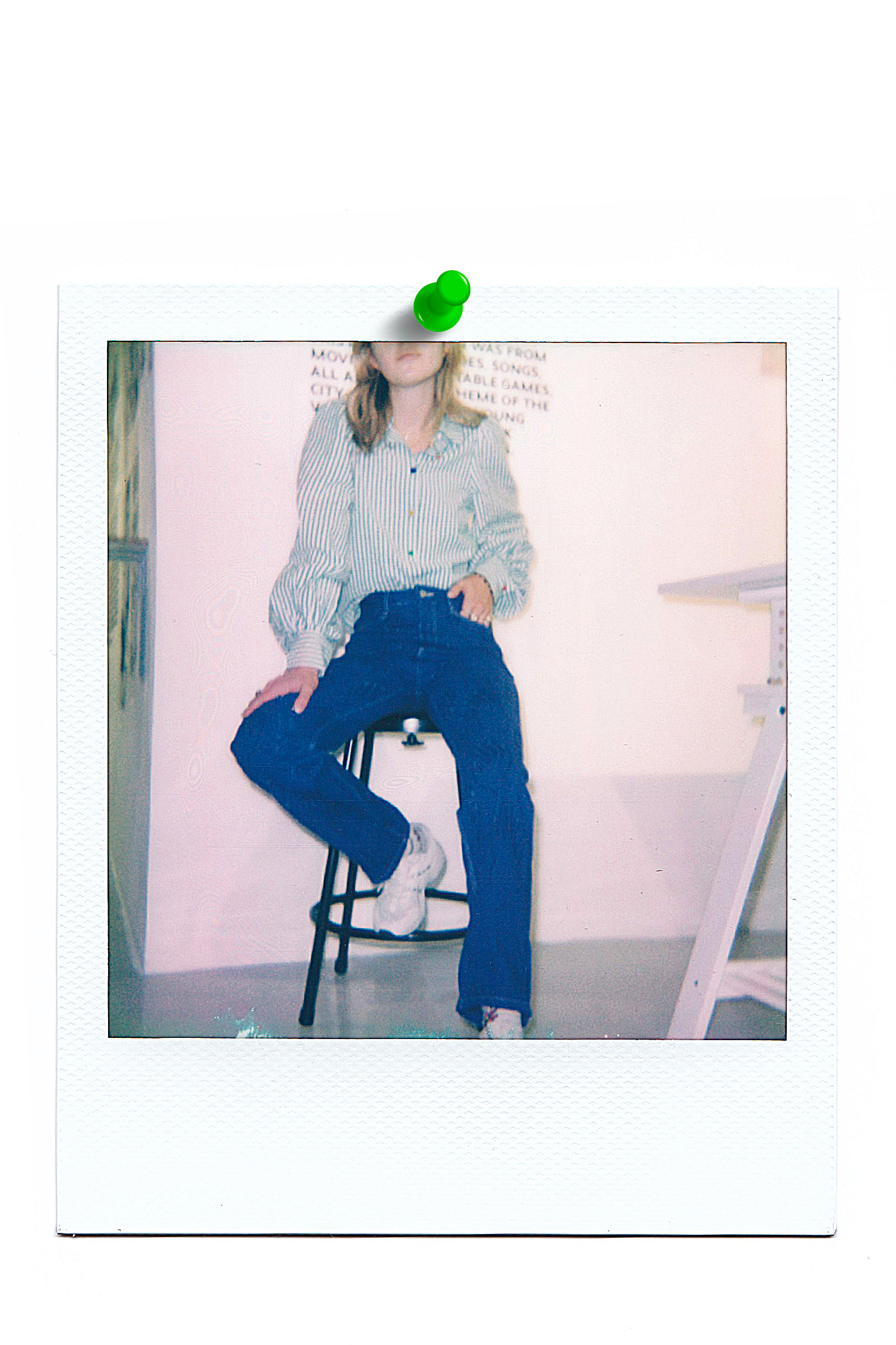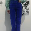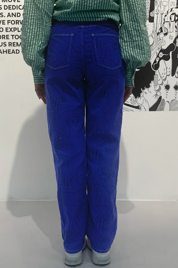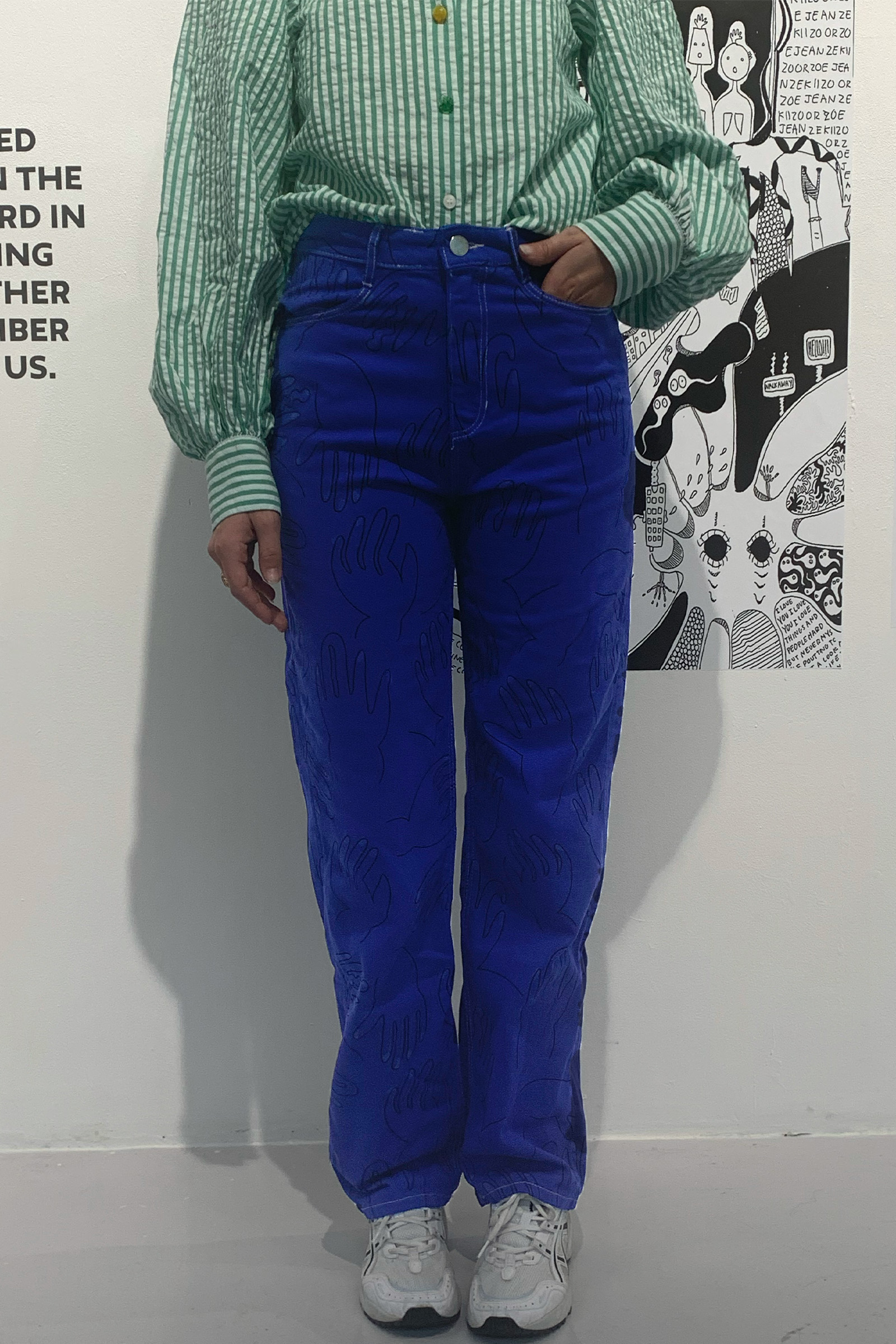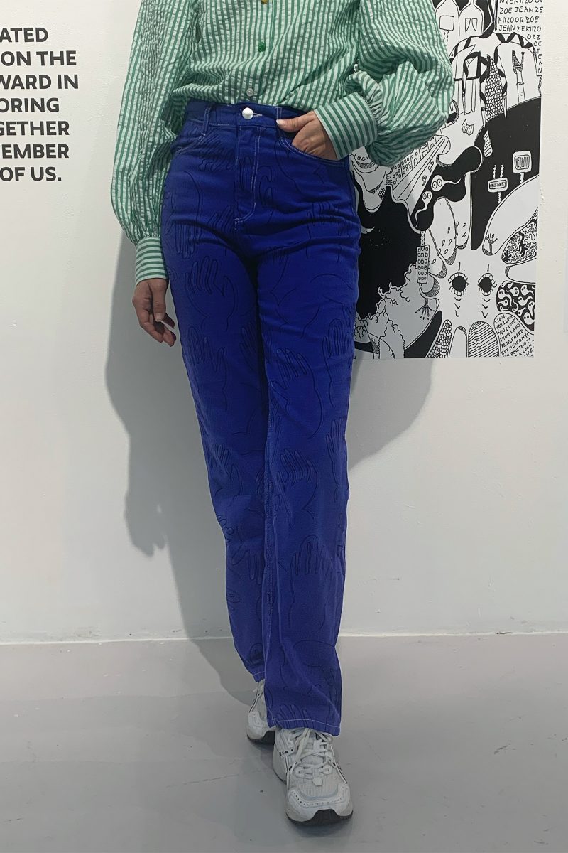 Straight leg high waist jeans printed with an all over hand pattern. The pants are made from organic cotton and they are piece dyed.