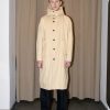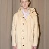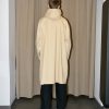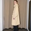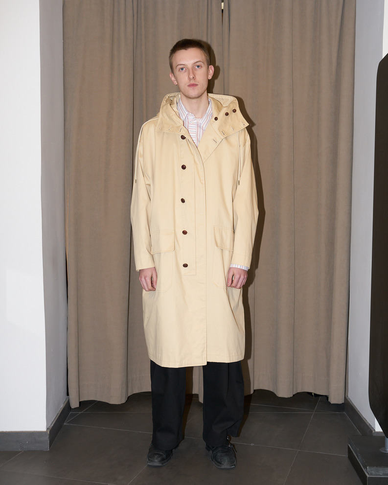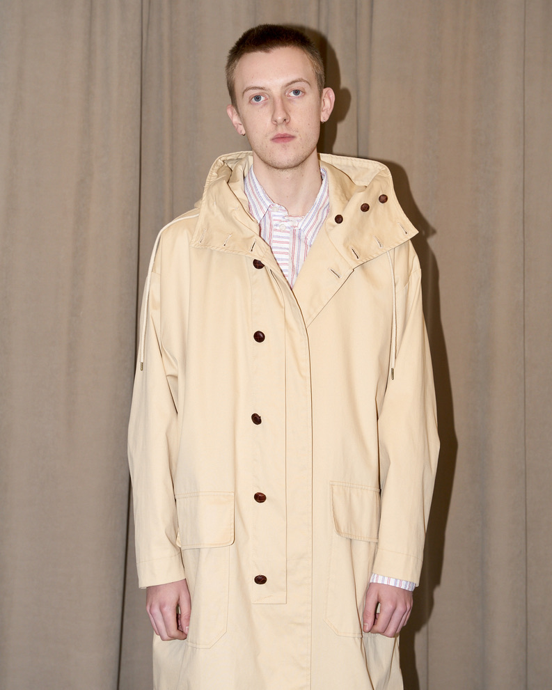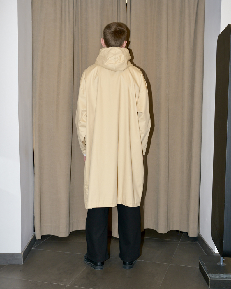 Oversized hooded trench coat with high collar, large pockets and leather buttons.