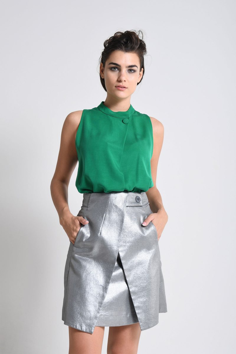 Jupe courte faux portefeuille avec poches et entièrement doublé.