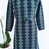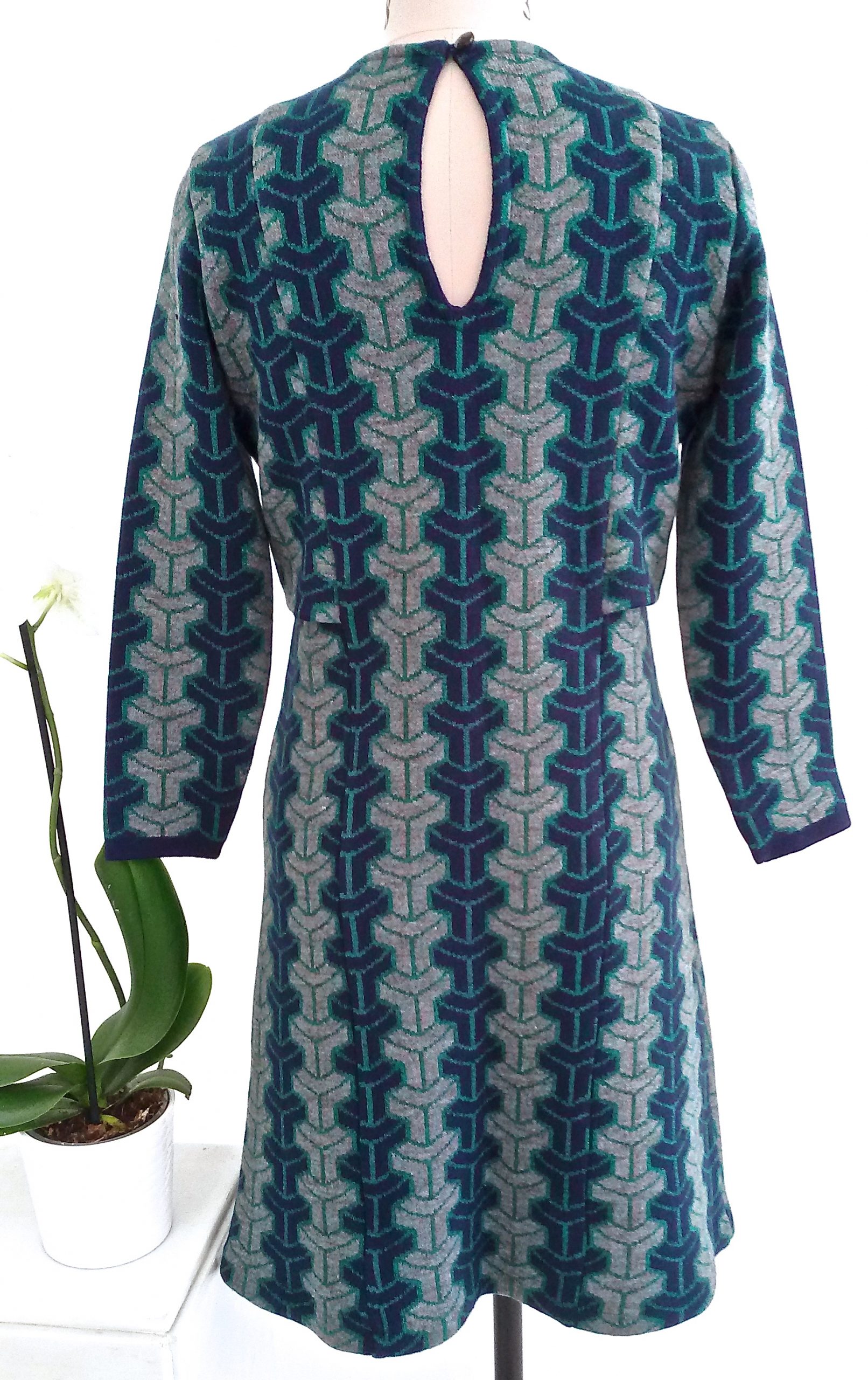 Trompe l’oeil two piece textured knit dress with a line skirt.
