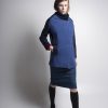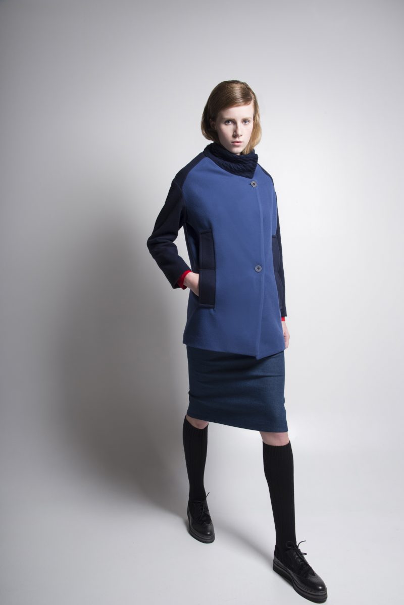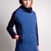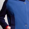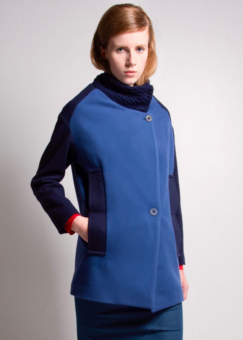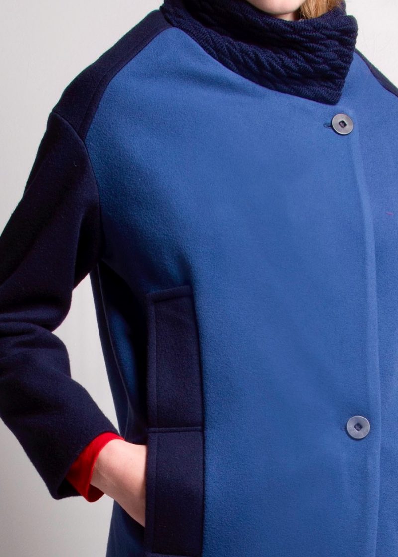 Color block short coat with drop shoulder and high knit collar, lit has large pockets and big buttons.