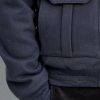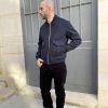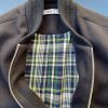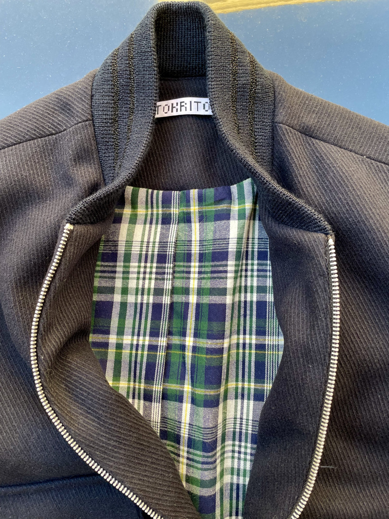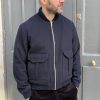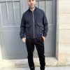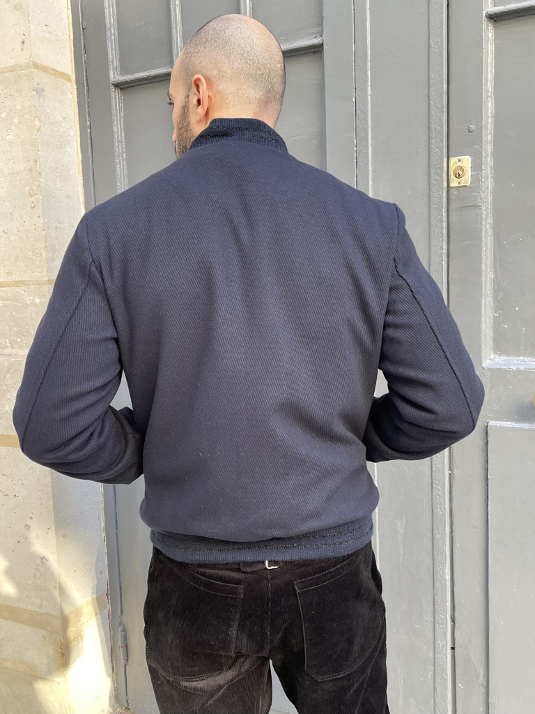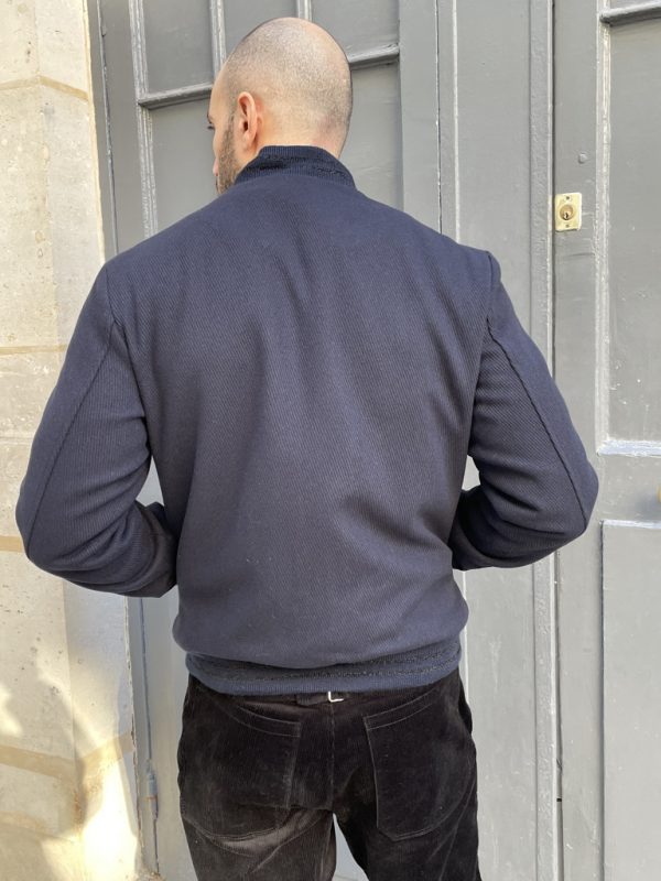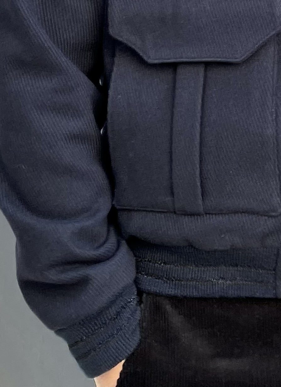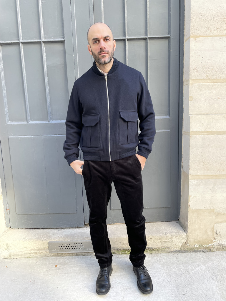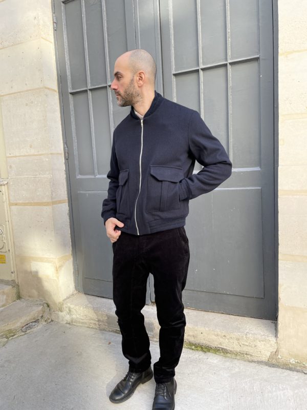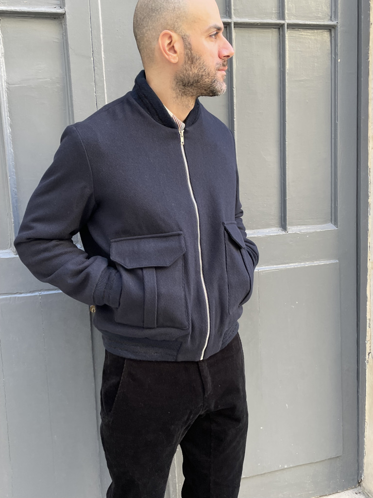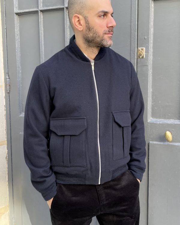 Navy Wool Twill bomber jacket, tailored with versatile flap pockets and knitted ribbings with discreet metallic stripes . The jacket is entirely lined with Scotish plaid cotton and has an inside pocket.
