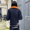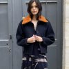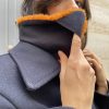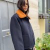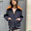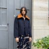 This cropped navy blue wool jacket combines utilitarian structure with refined detailing. Its boxy silhouette features large front patch pockets, adding a functional, workwear-inspired touch. The hidden button placket creates a clean, minimalist front line, allowing the craftsmanship and proportions to stand out. A detachable warm orange shearling collar adds a bold accent of color and texture, offering both versatility and comfort — wear it with or without the collar for two distinct looks.