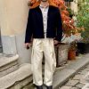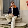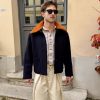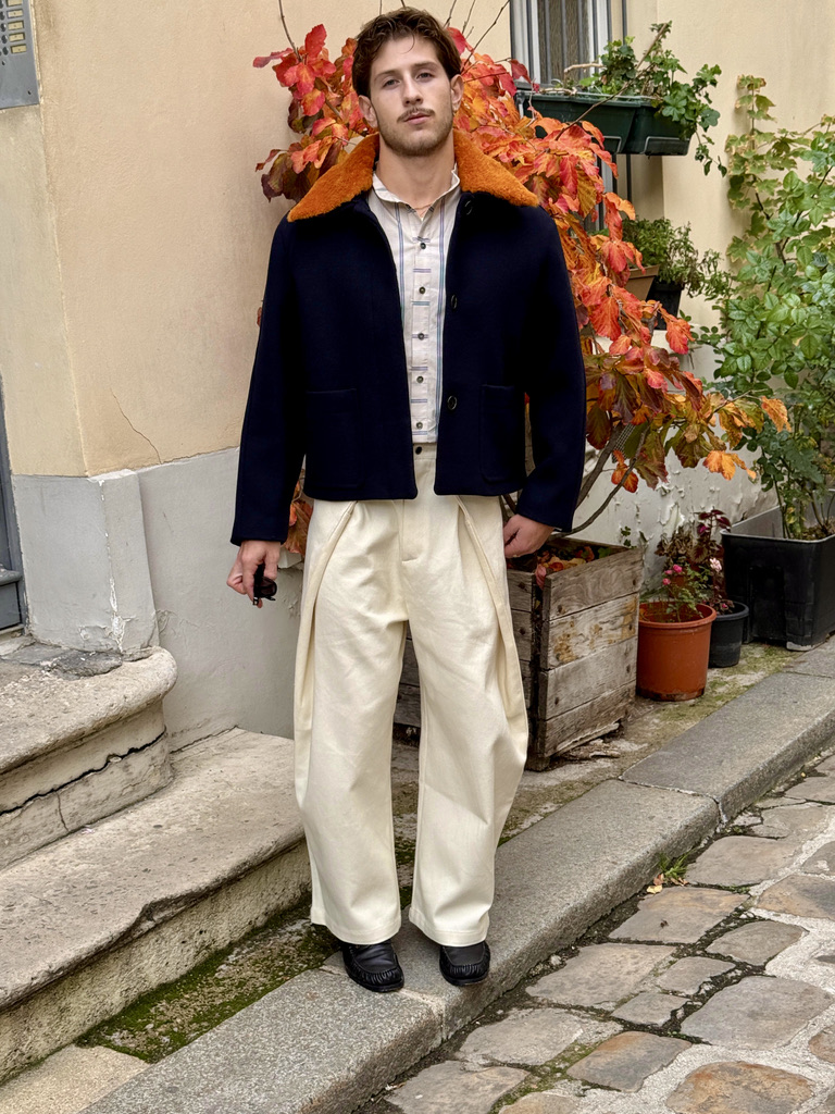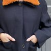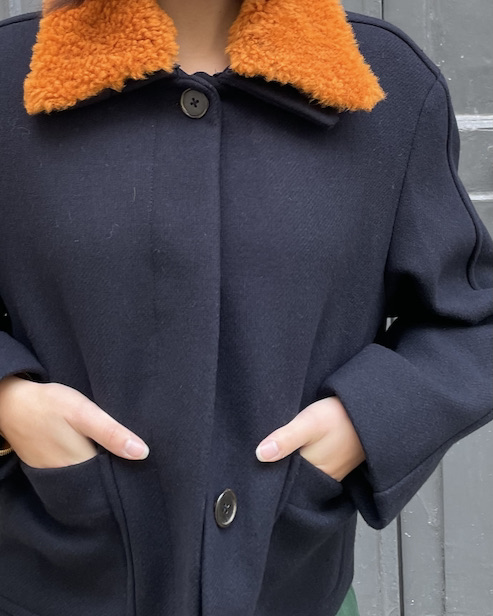 This cropped navy blue wool jacket combines utilitarian structure with refined detailing. Its boxy silhouette features large front patch pockets, adding a functional, workwear-inspired touch. The hidden button placket creates a clean, minimalist front line, allowing the craftsmanship and proportions to stand out. A detachable warm orange shearling collar adds a bold accent of color and texture, offering both versatility and comfort — wear it with or without the collar for two distinct looks.