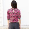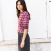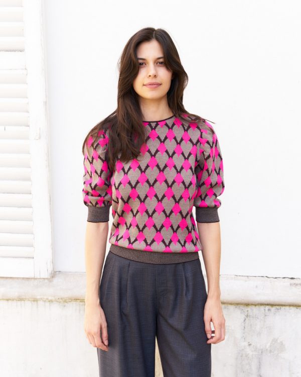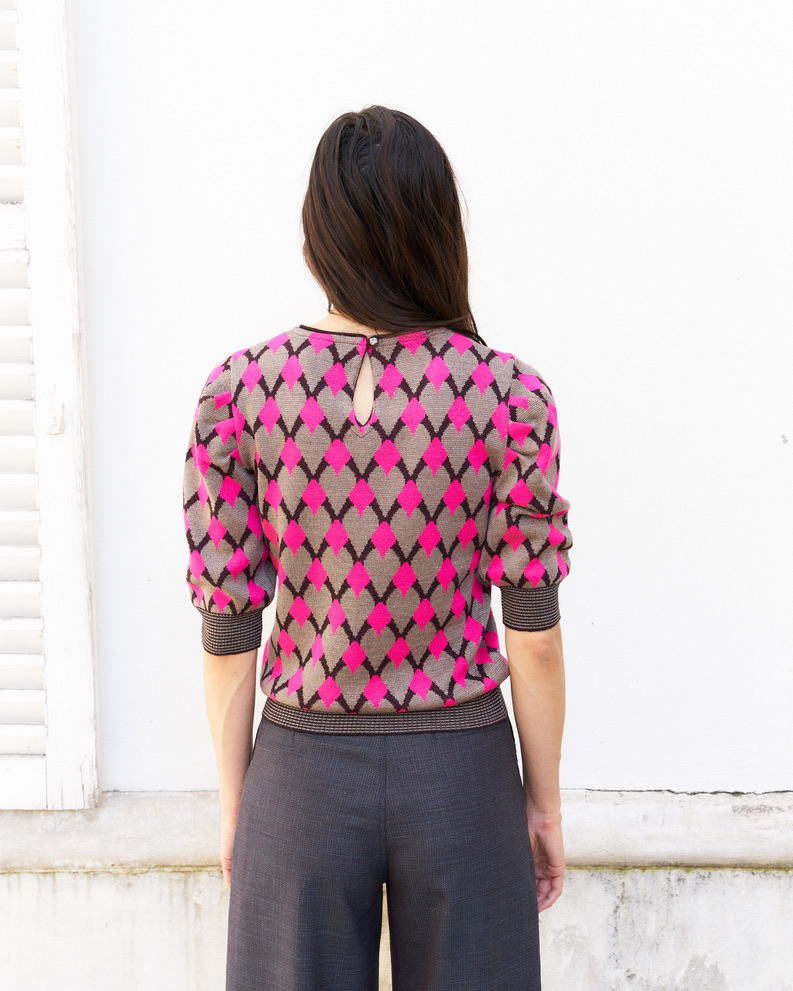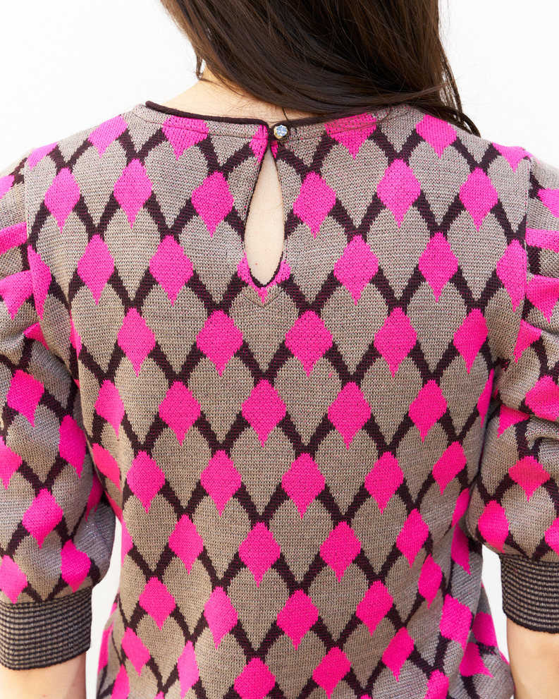 Geometric pattern jacquard sweater with puff elbow length sleeves and tear drop closing on the back, Inspired from 1940s knitwear.