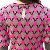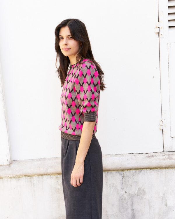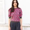 Margaery-Puff Sleeve Geometric Jacquard Sweater-Pink/Beige/Prune