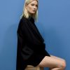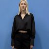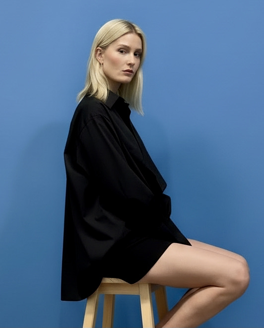 This double-layered oversize couture shirt features a gathered balloon hem with a dramatic high–low silhouette: cropped at the front and extended at the back for fluid volume and coverage. Finished with a classic collar, front opening, and oversized sleeves with elongated buttoned cuffs, it’s a sculptural statement piece that balances structure and movement.