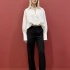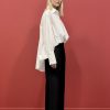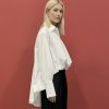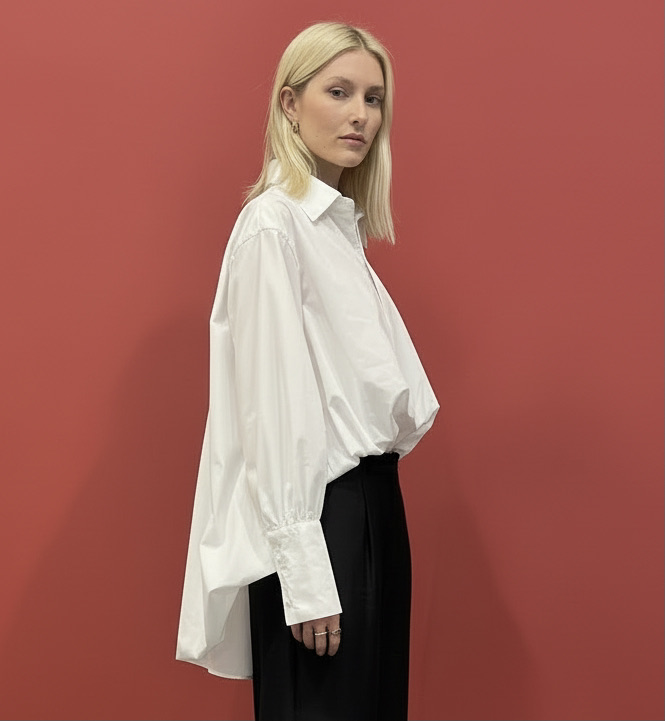 This double-layered oversize couture shirt features a gathered balloon hem with a dramatic high–low silhouette: cropped at the front and extended at the back for fluid volume and coverage. Finished with a classic collar, front opening, and oversized sleeves with elongated buttoned cuffs, it’s a sculptural statement piece that balances structure and movement.
