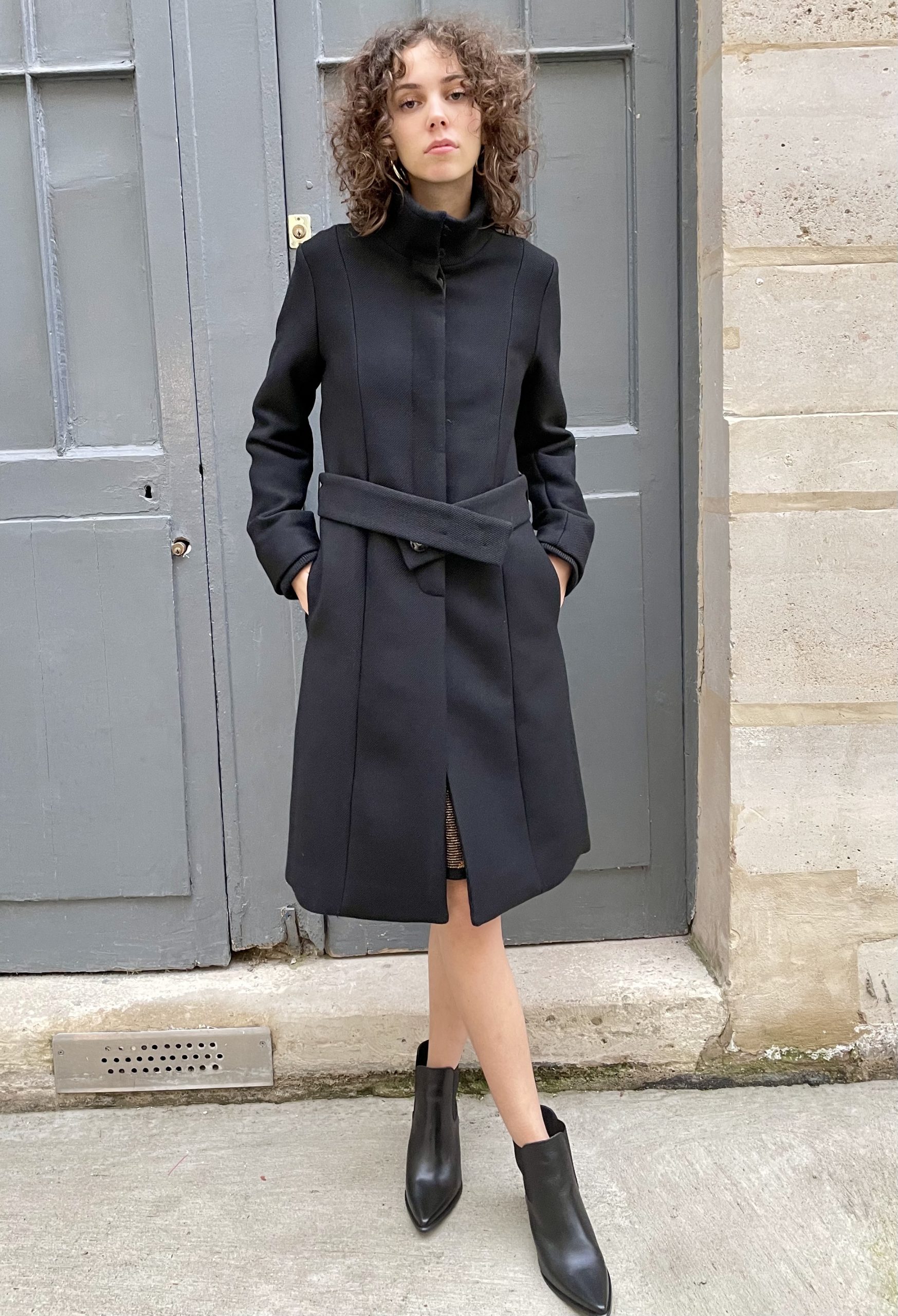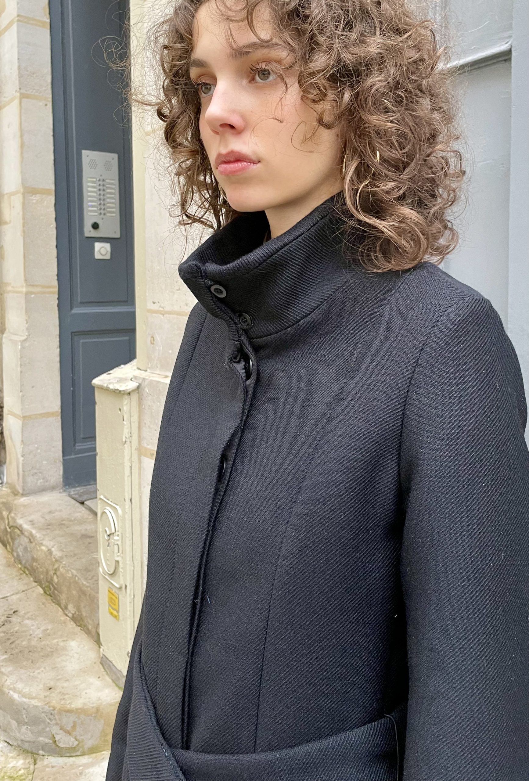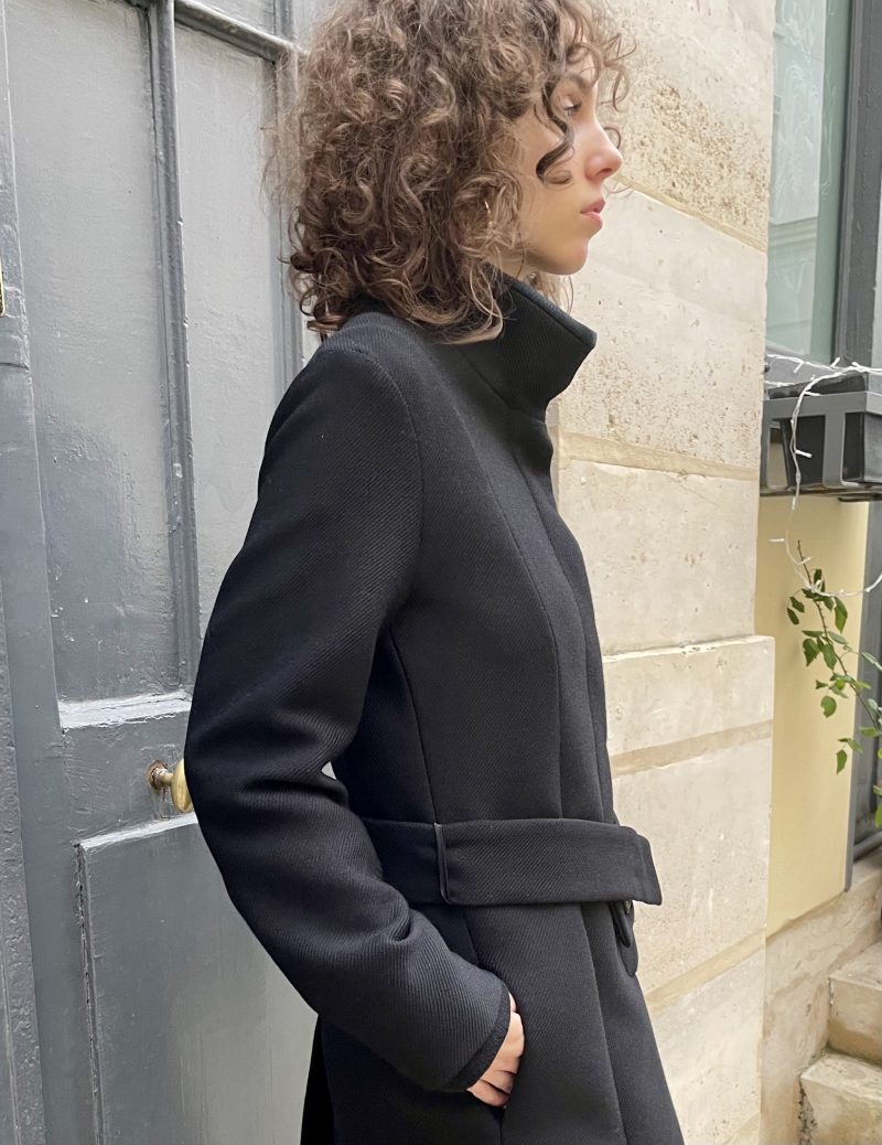Wool Twill tailored fitted coat with high collar in luxurious fabric lined with sparkling textured silk. It closes with a belt from the same material and large adjustable snaps and it features 2 side pockets, hidden buttons and slit opening at the back. The collar trimming and cuffs are out ribbed knit.