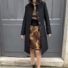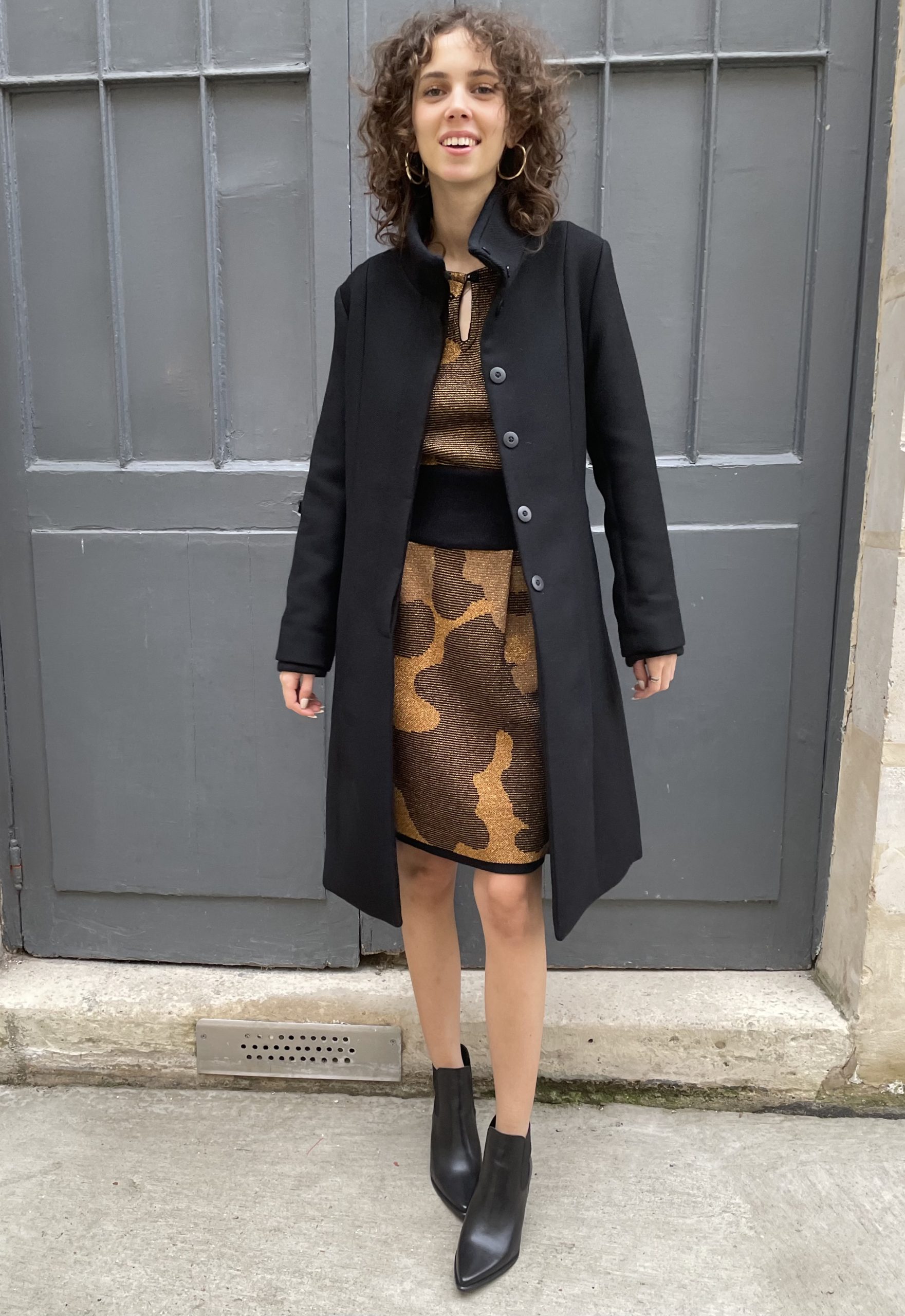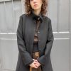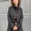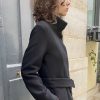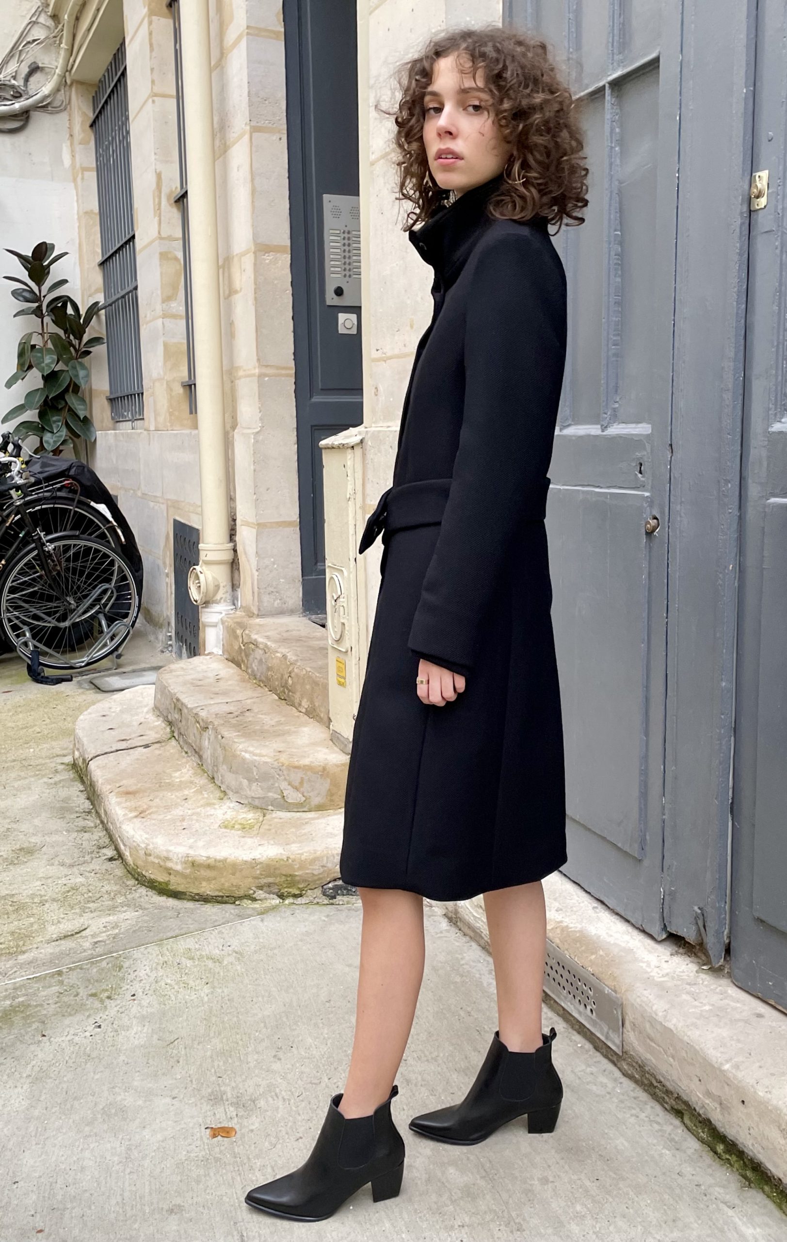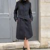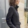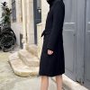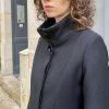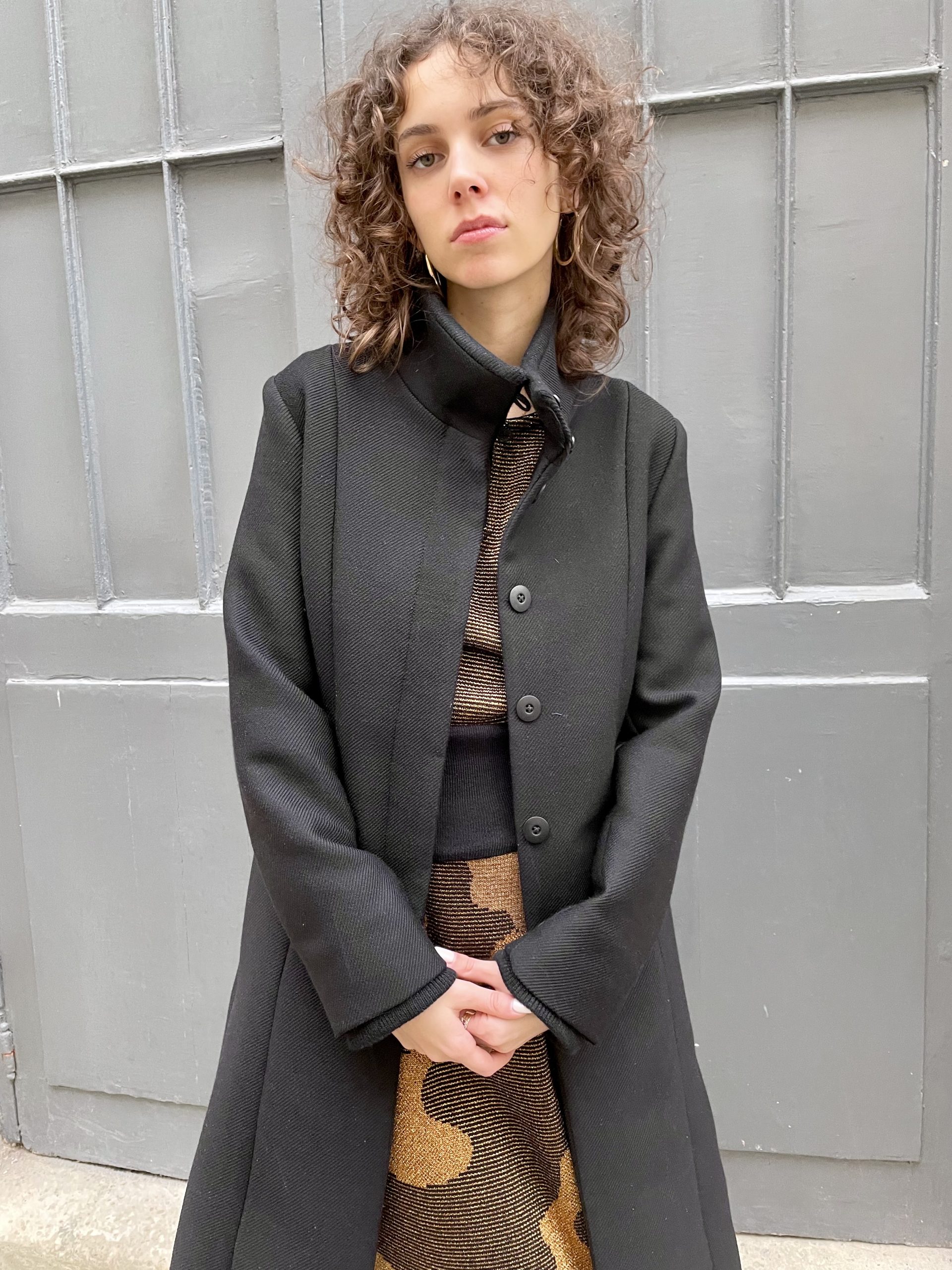 Wool Twill tailored fitted coat with high collar in luxurious fabric lined with sparkling textured silk. It closes with a belt from the same material and large adjustable snaps and it features 2 side pockets, hidden buttons and slit opening at the back. The collar trimming and cuffs are out ribbed knit.