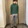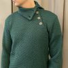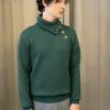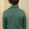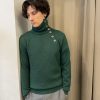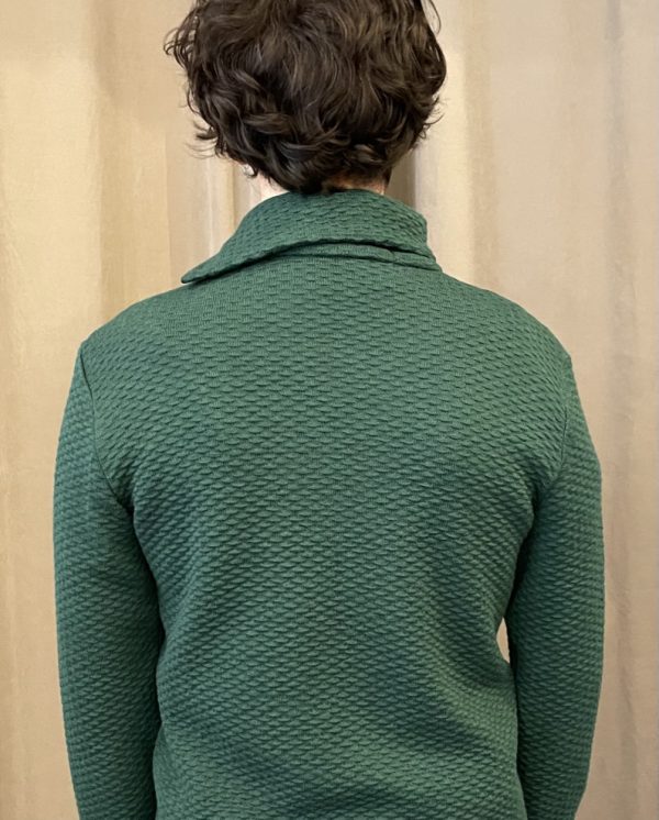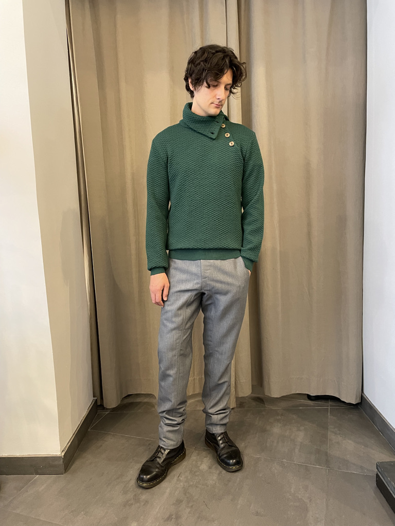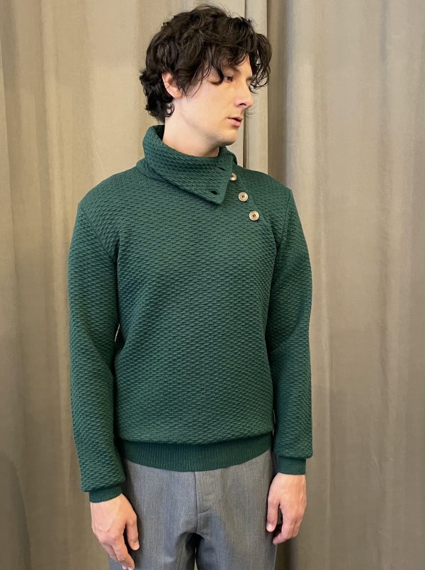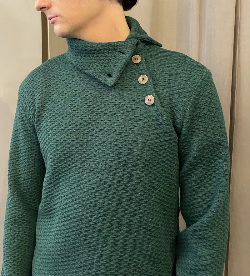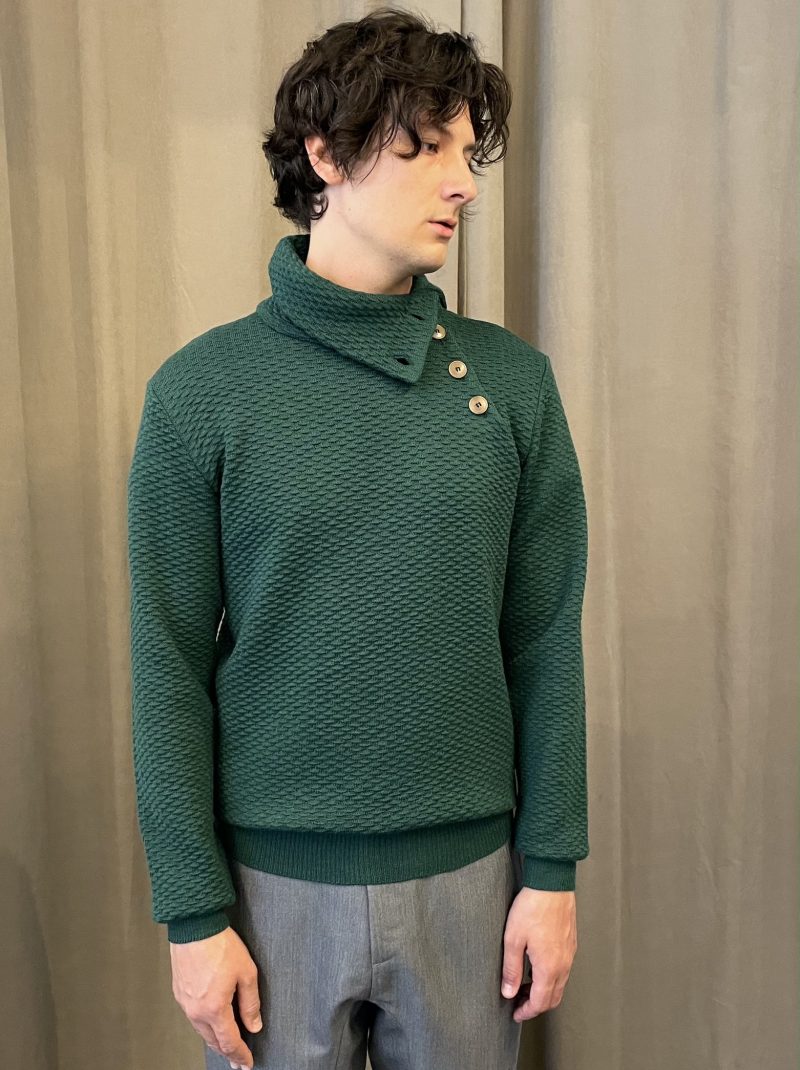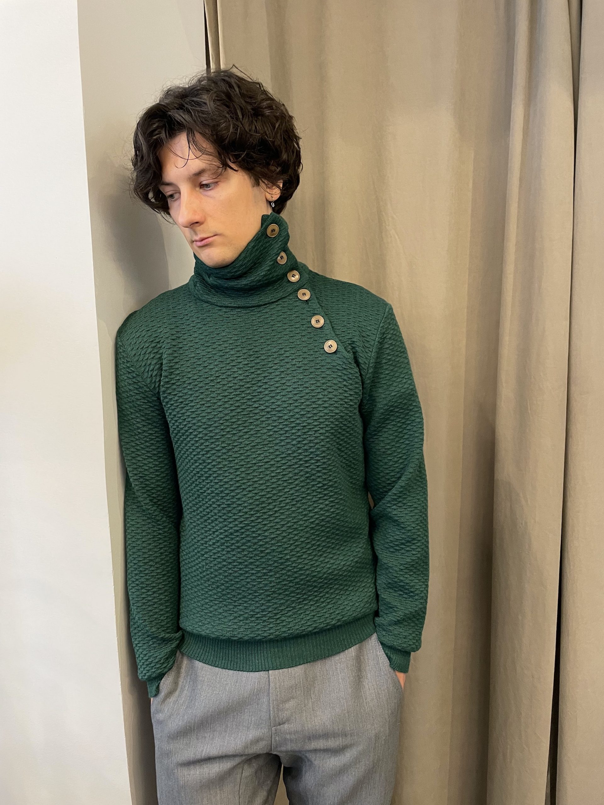 A turtleneck  sweater featuring a dynamic textured pattern, woven in soft yarns that evoke a retro feeling. The turtleneck includes a diagonal buttoned opening, allowing one side of the collar to fall open — a small gesture that transforms structure into ease.