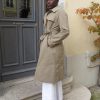 Waterproof beige trench with raglan sleeves in luxurious Italian tech fabric, lined with striped silk. It closes with a belt from the same material and it features 2 side pockets and a slit opening at the back.