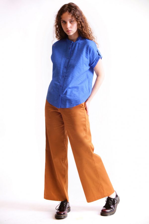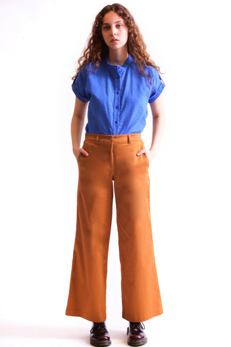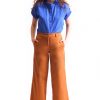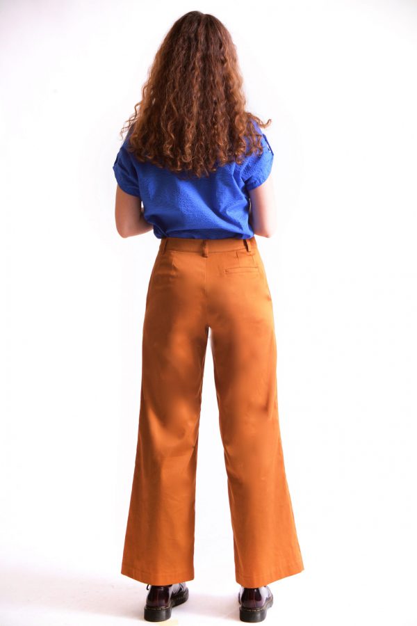 Wide leg caramel pants in stretch cotton with two side pockets and one slit back pocket.
