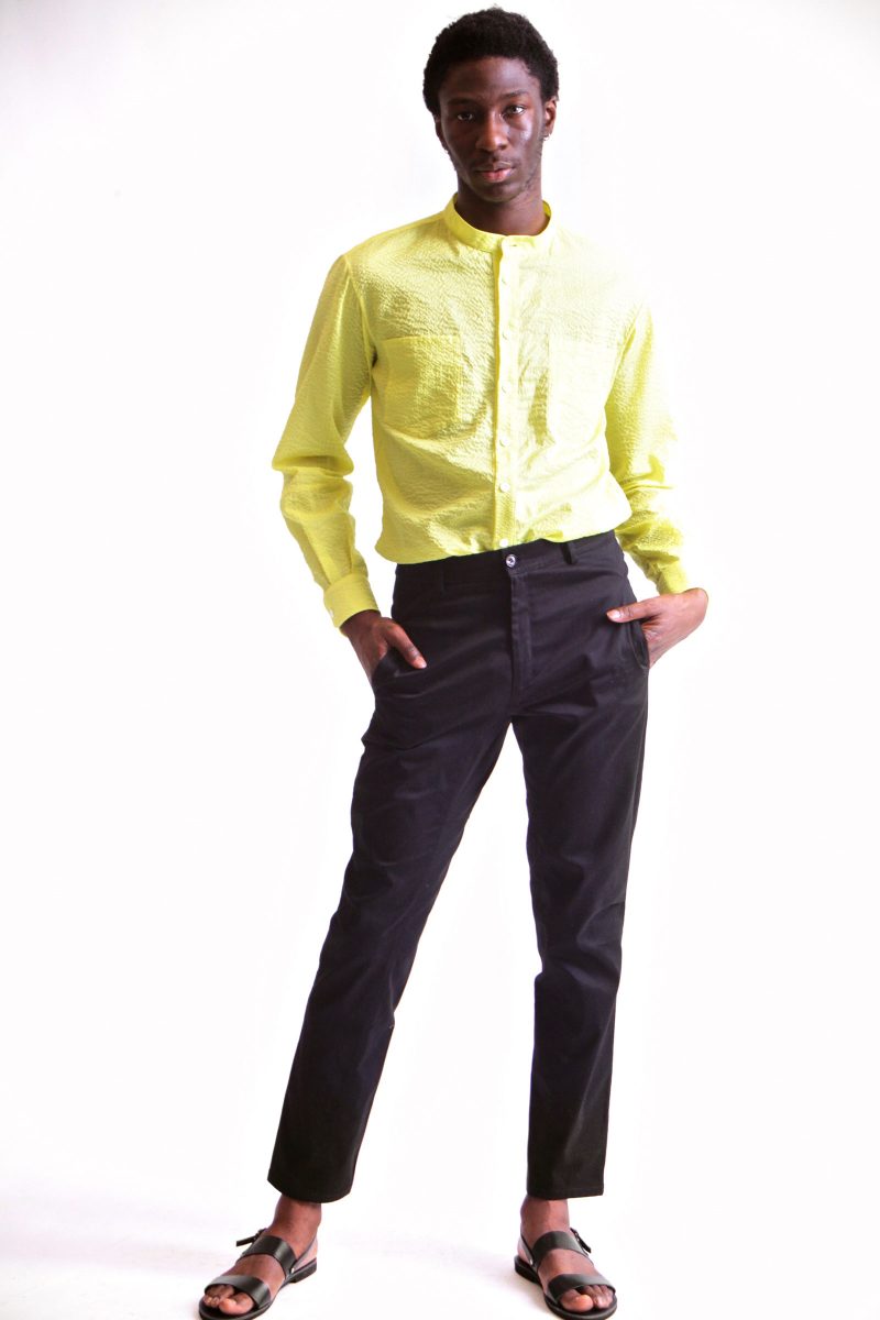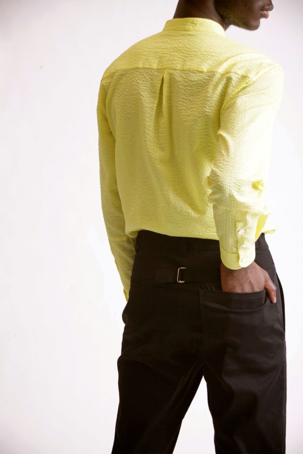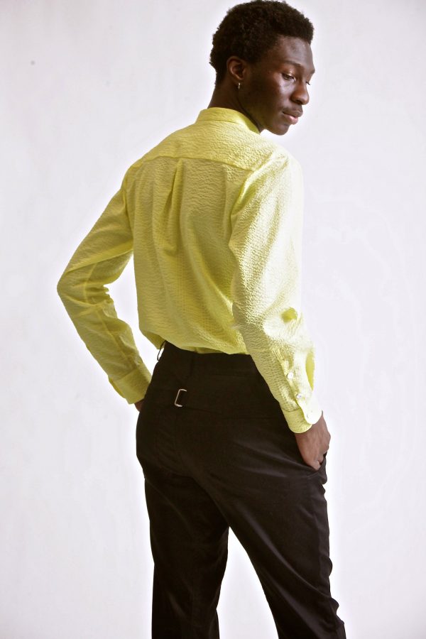 Tailored pants in black cotton with two front pockets. On the back they have two patch pockets and an adjustable strap.
