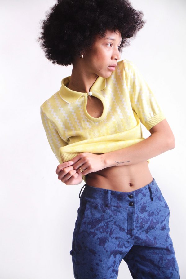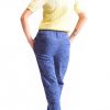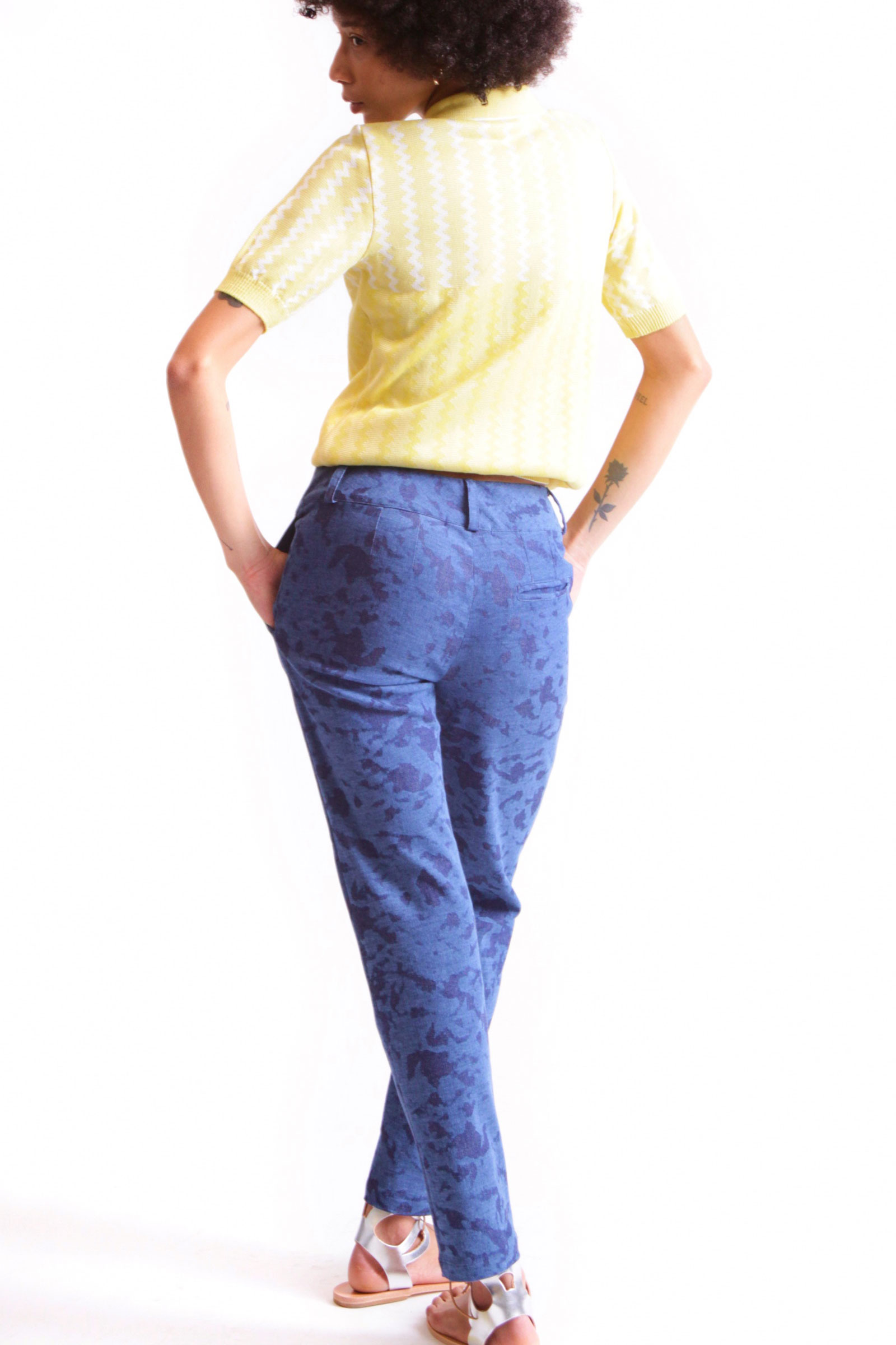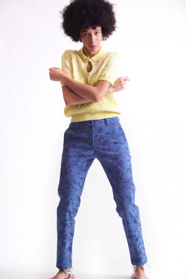Slim leg black pants in printed stretch denim with two side pockets and one slit back pocket.