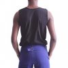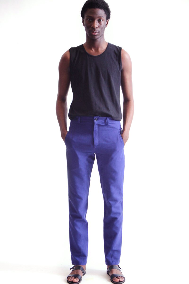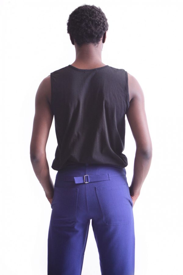 Tailored pants in indigo blue cotton with two front pockets. On the back they have two patch pockets and an adjustable strap.
