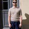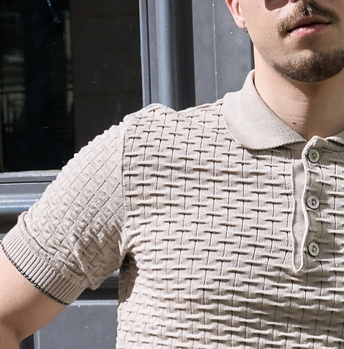 Crafted from basket weave textured knit, this classic fit polo shirt offers a sophisticated twist on a wardrobe staple. The fine metallic trimmings add a subtle touch of modern elegance, making it a refined choice for both casual and smart-casual styling.