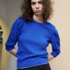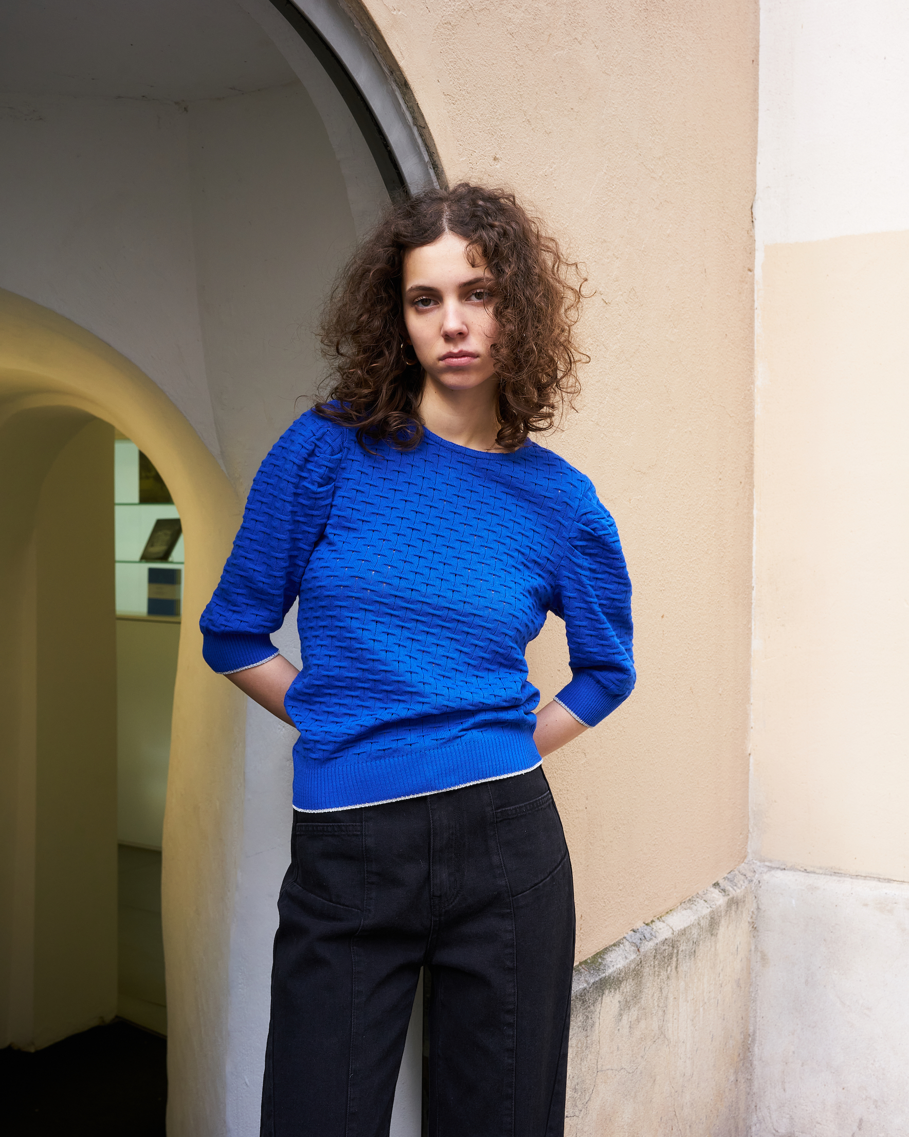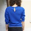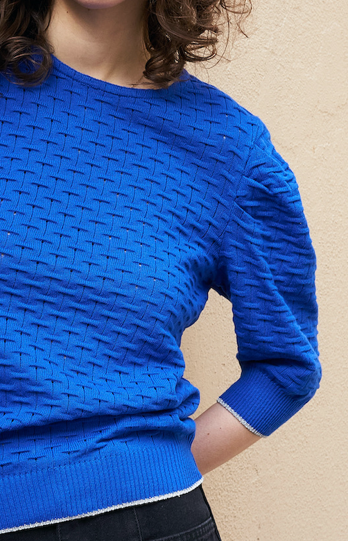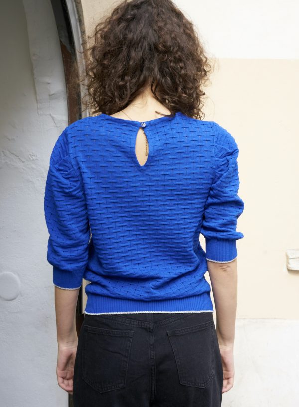 Textured knit sweater with puff elbow length sleeves and tear drop closing on the back, Inspired from 1940s knitwear.