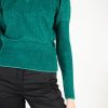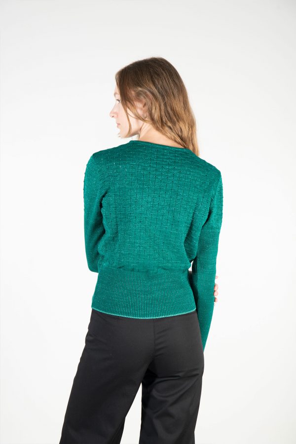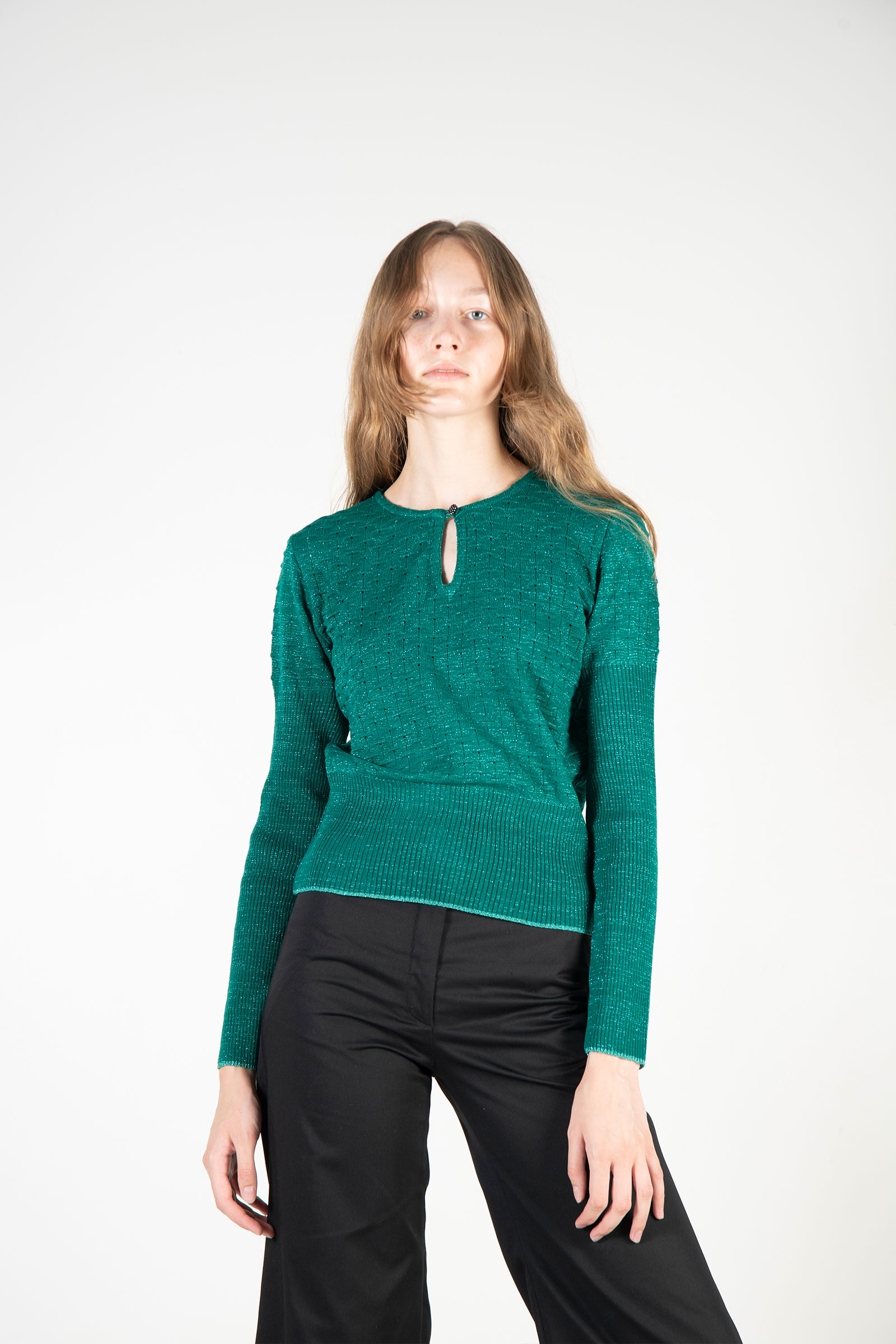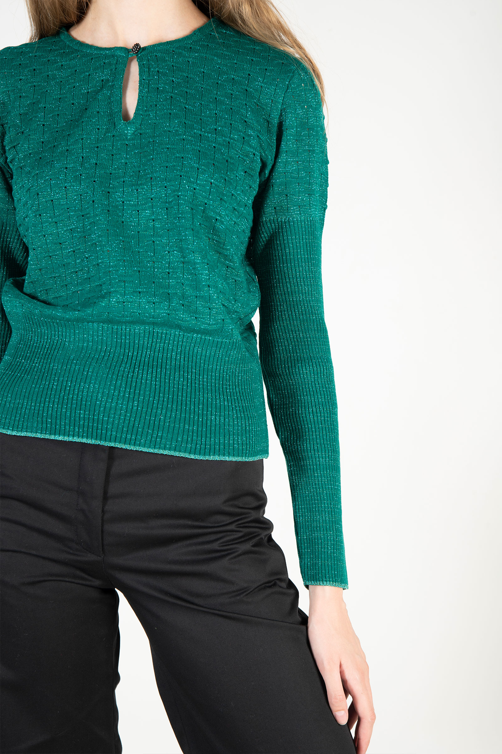Textured knit sweater with teardrop neck opening and long ribbed sleeves and large ribbed belt.