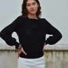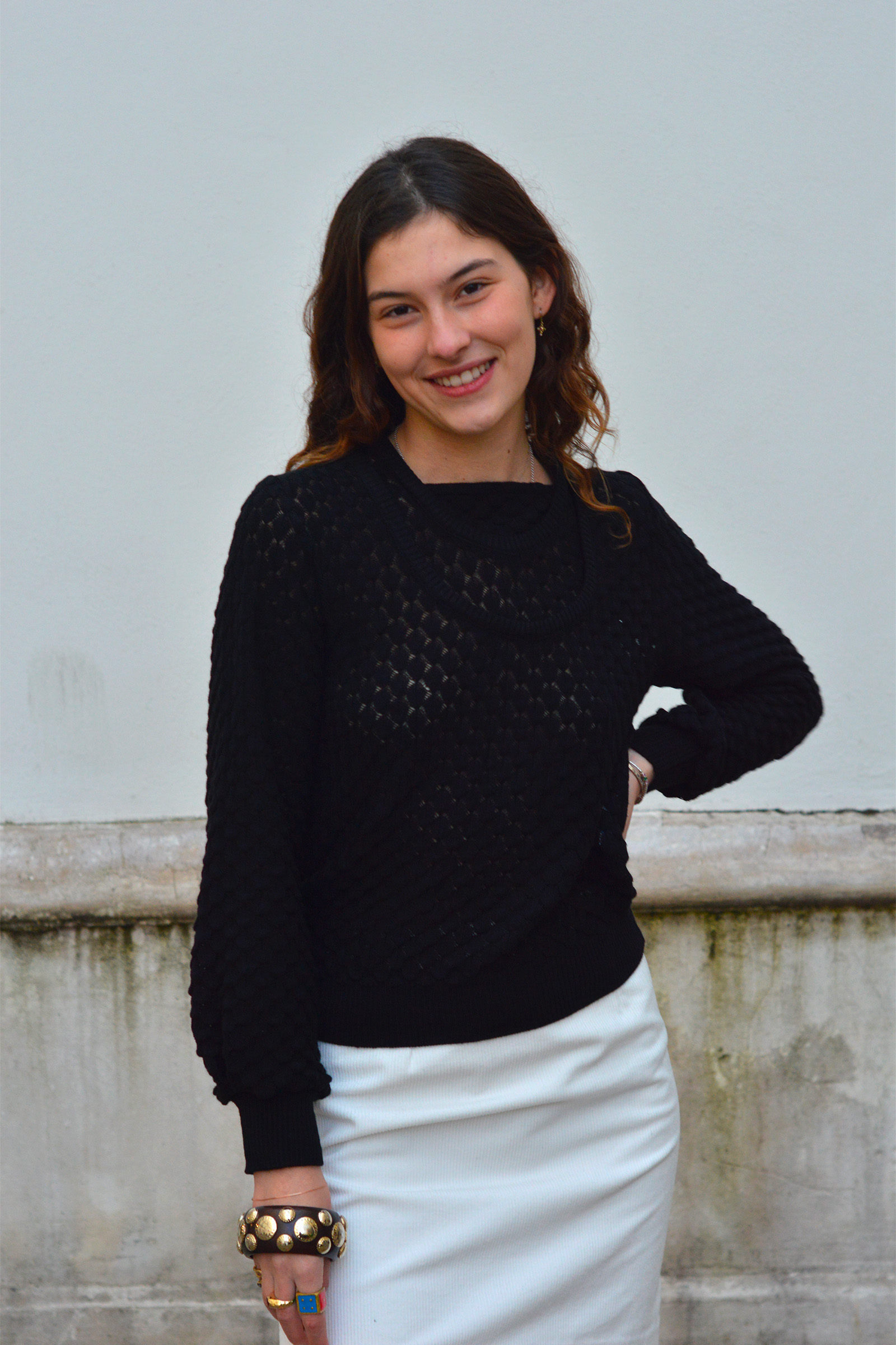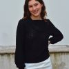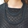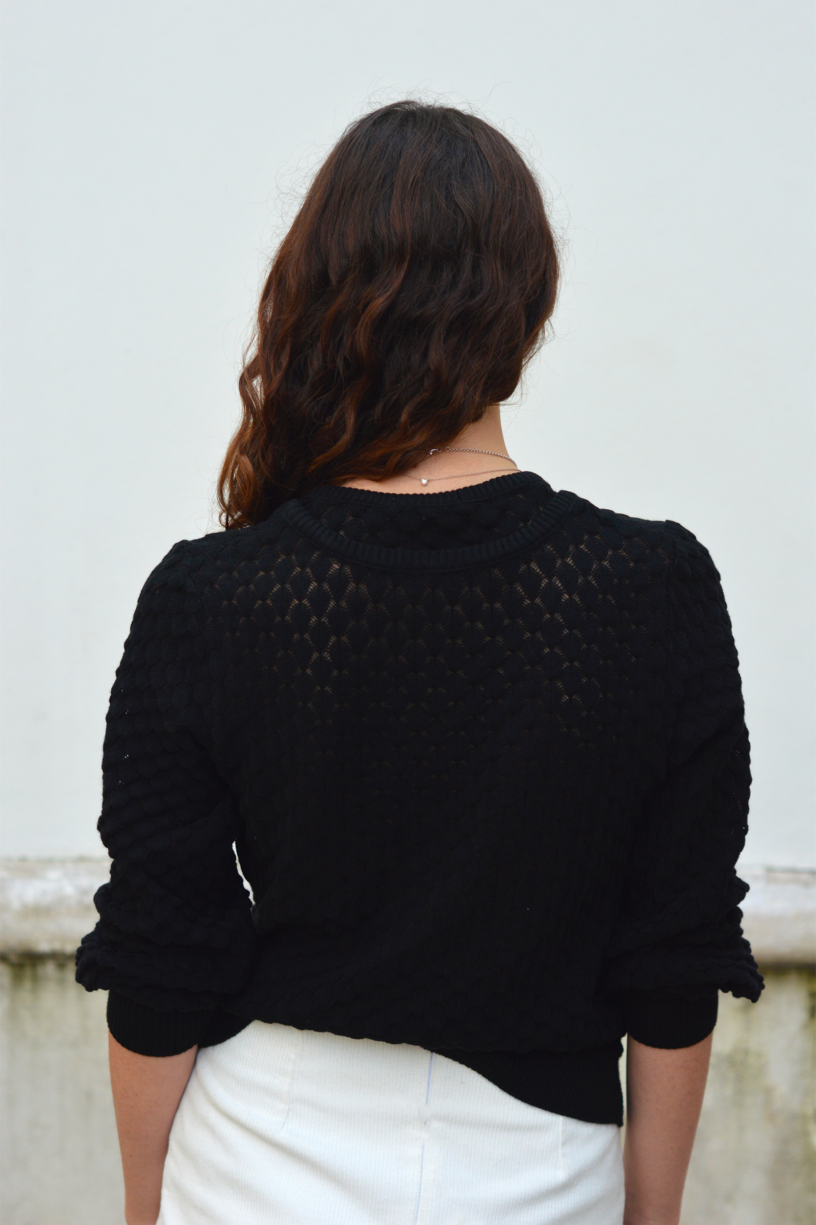 Pull en maille à dentelle texturé. Jeu de cols en trompe l’oeil face avant, avec des manches légèrement bouffantes.