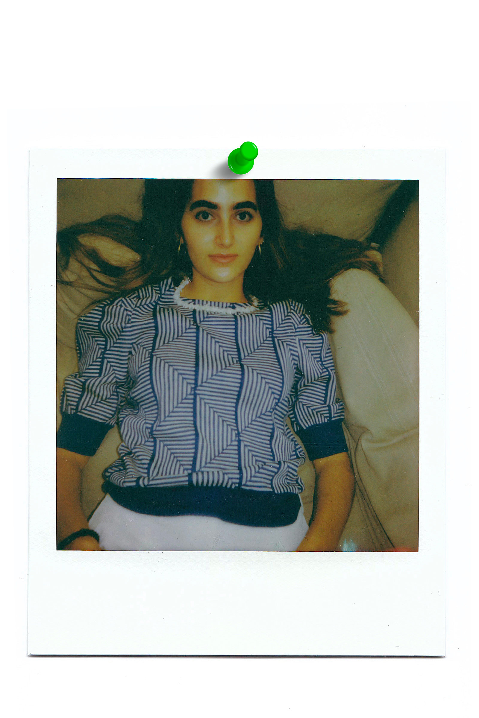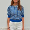 Pull à motifs géométriques à manches 3/4 tricoté en laine/coton, ouverture goutte d’eau au dos.