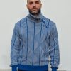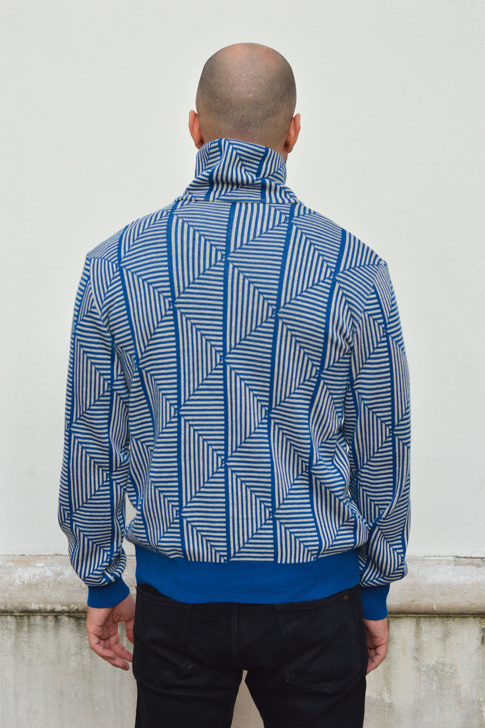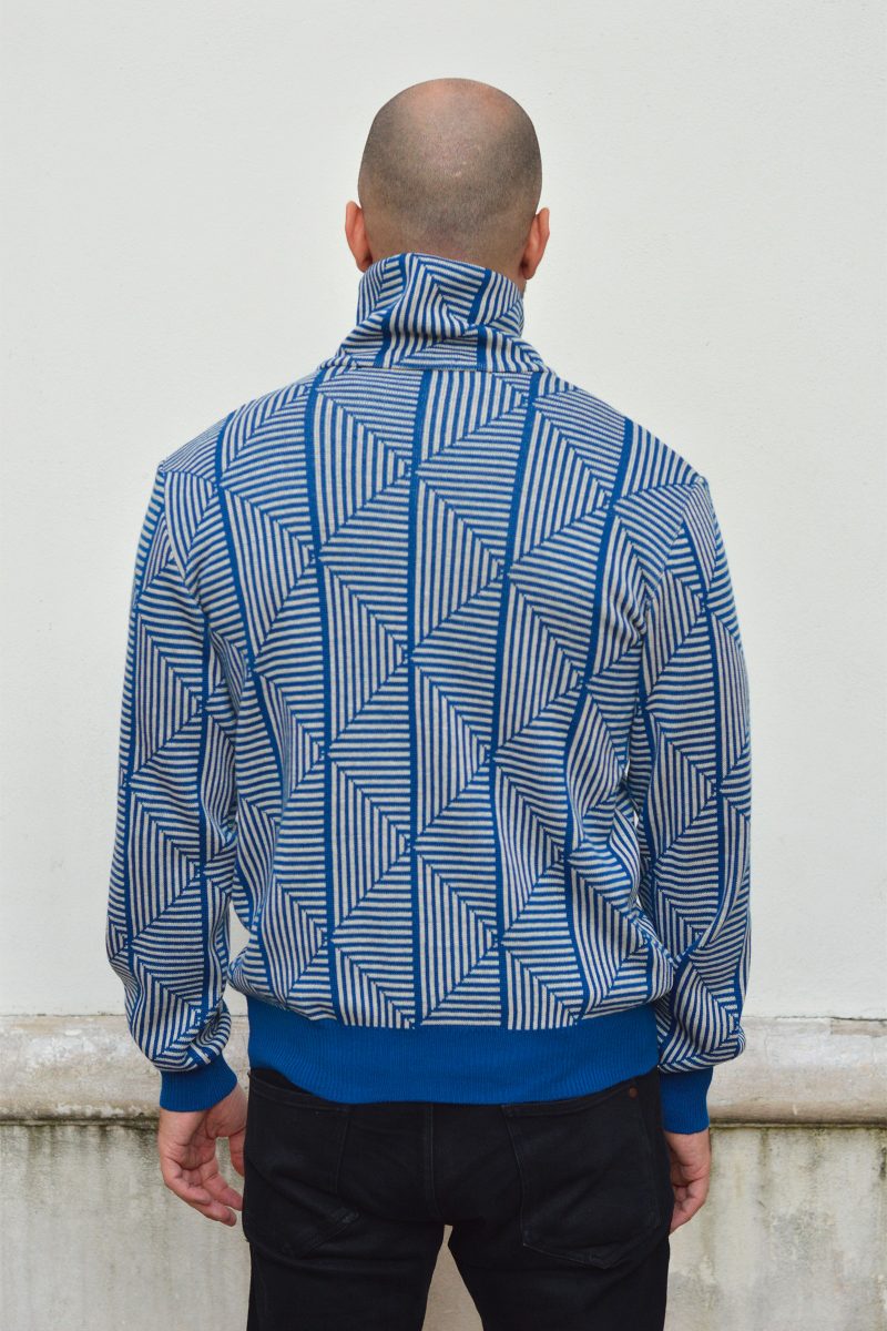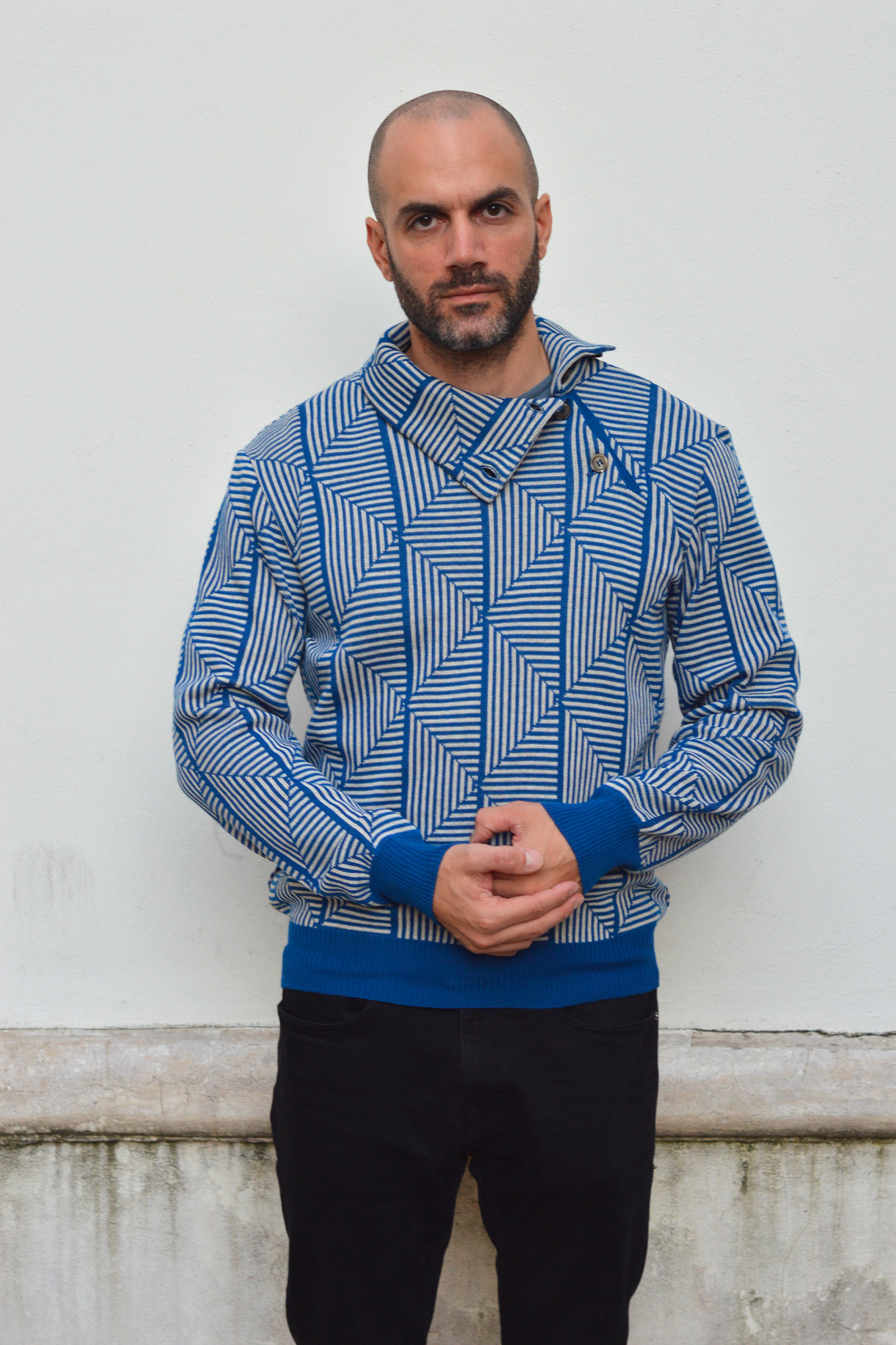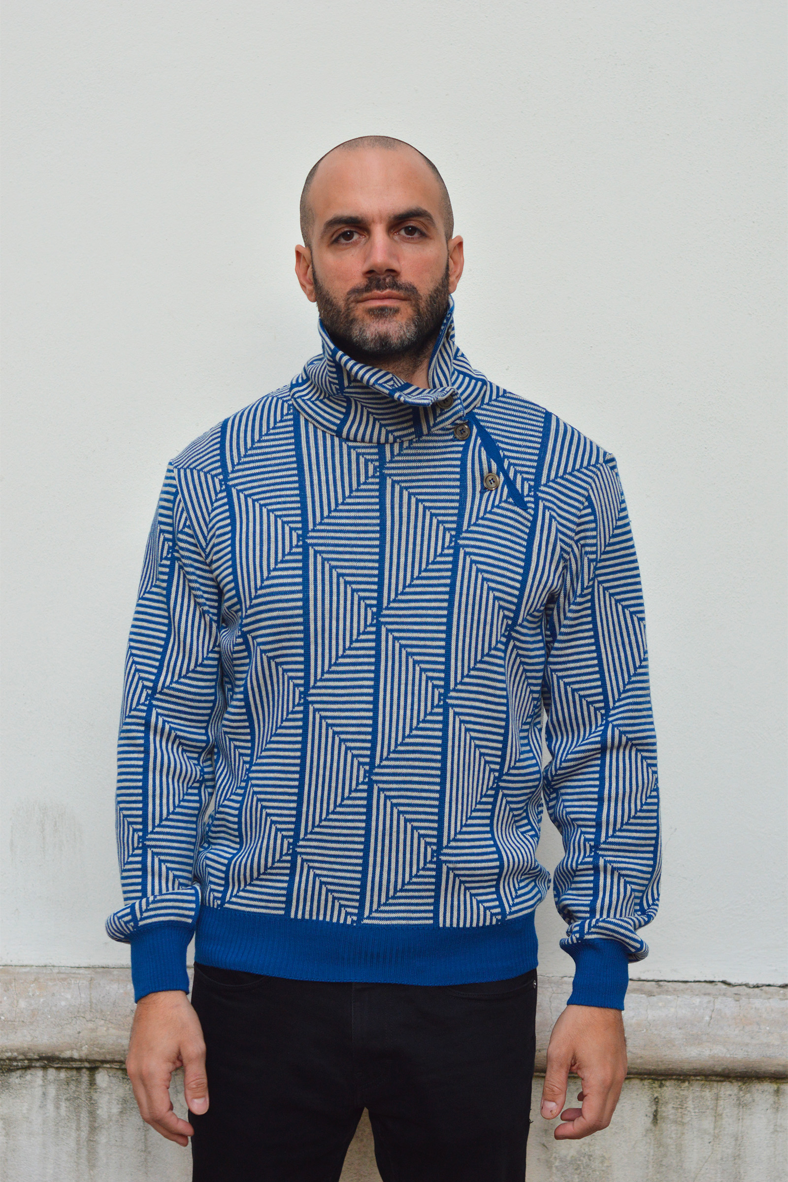 Pull en maille texturé à motifs géométriques, col montant ajustable avec boutons.