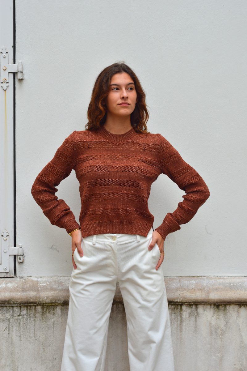 Pull Qorita en rayures ajourées et en points de jersey en fils lurex. Le pull arbore une coupe slim, un col rond et des bords côtes fendus au bas du pull et au niveau des poignets.