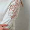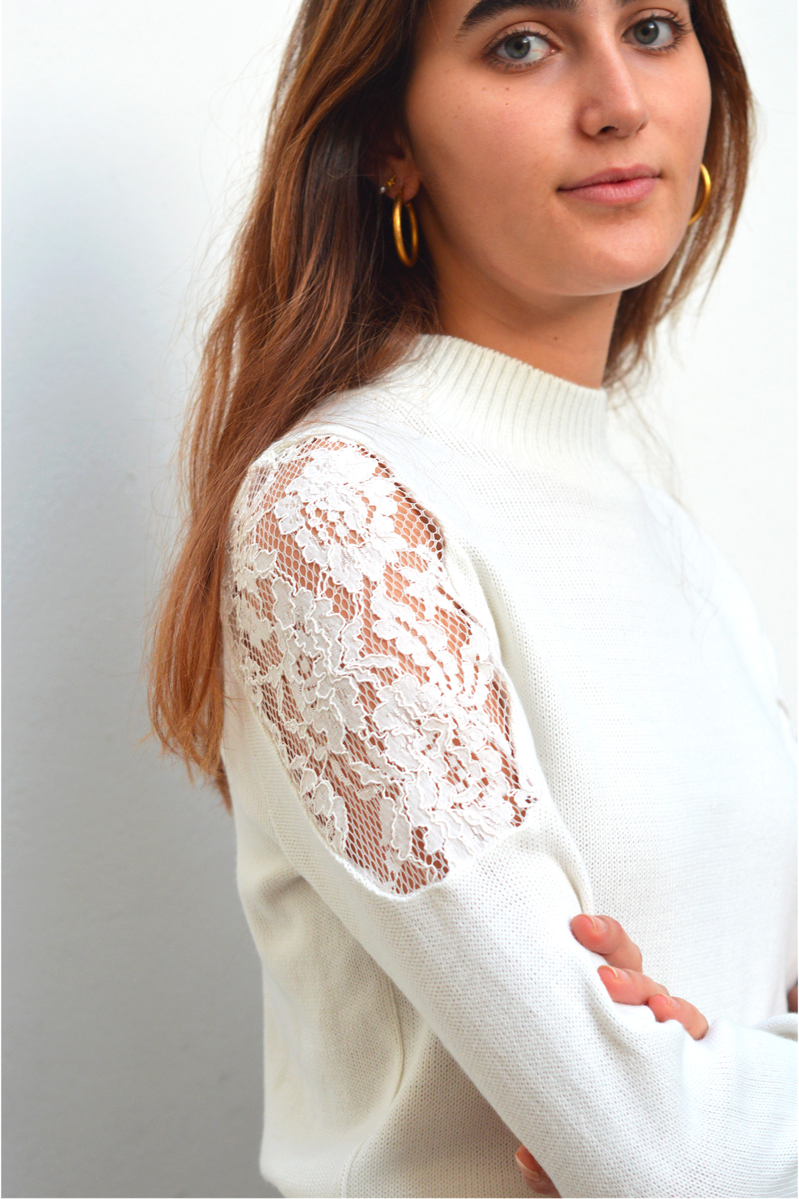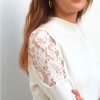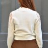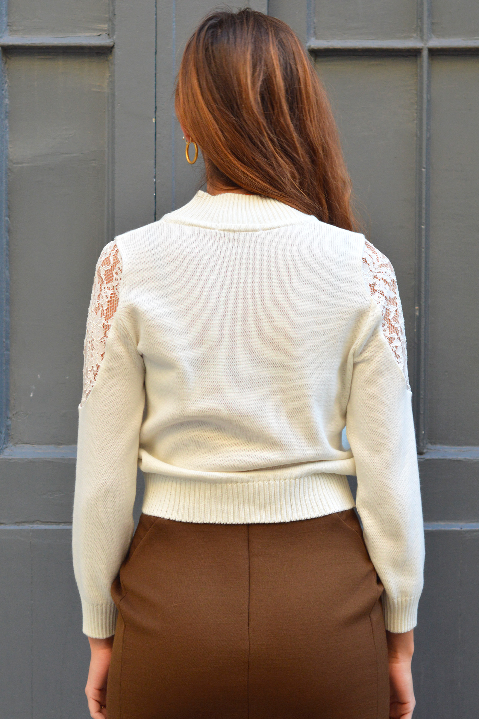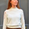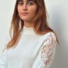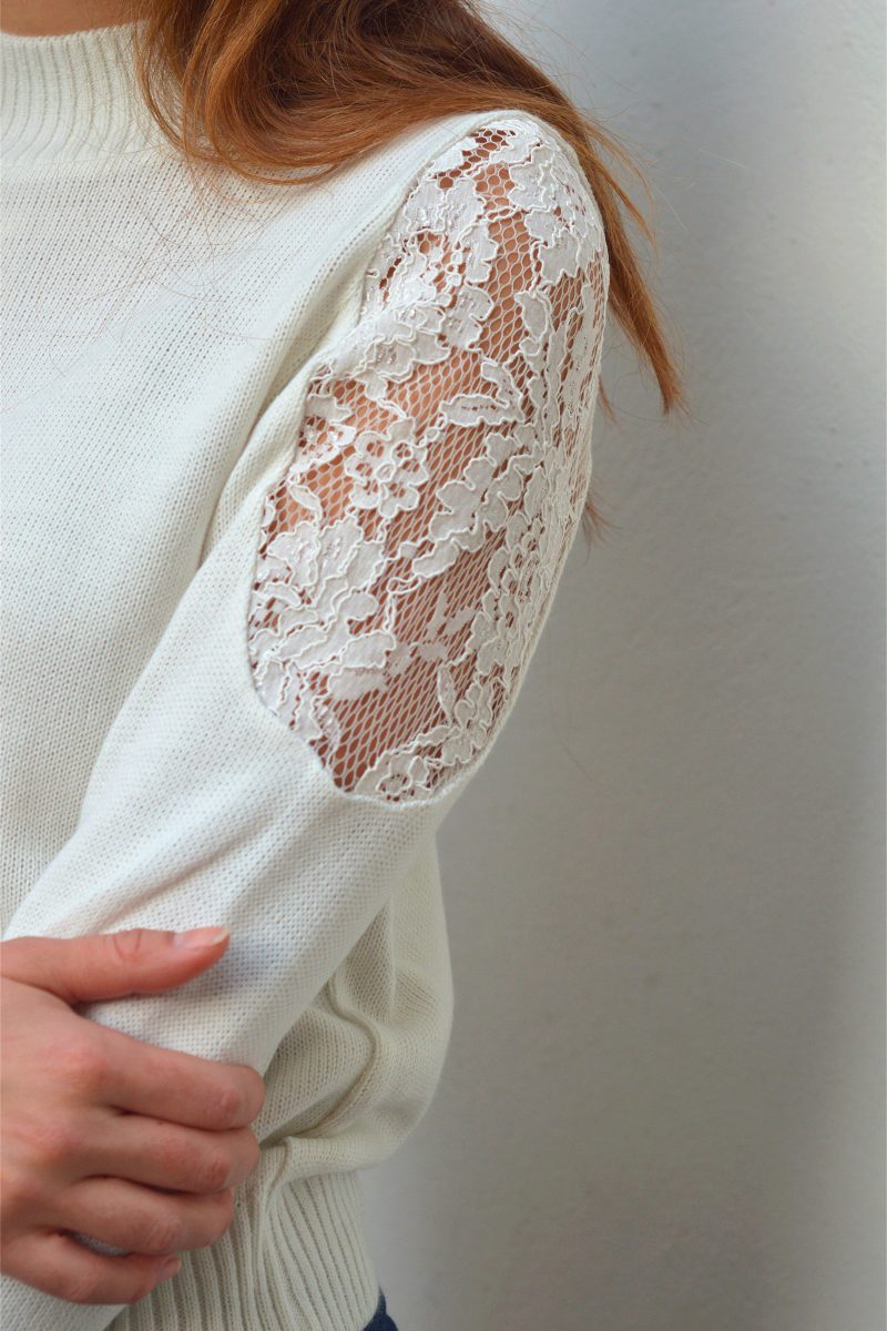 Pull en mélange laine et coton à col montant orné de guipure ajourée au niveau des manches.