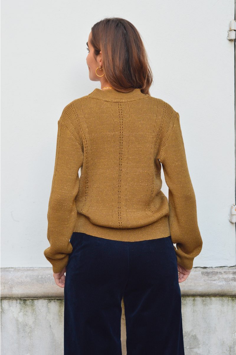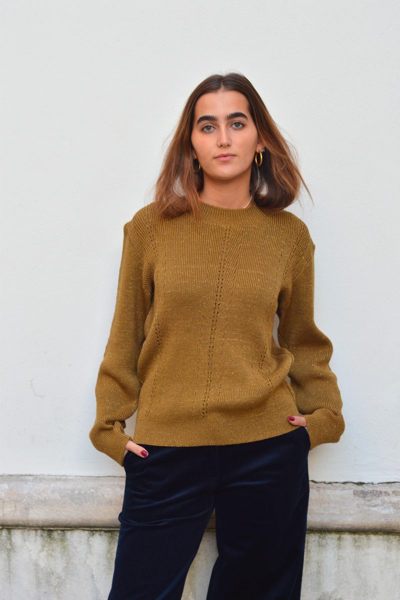 Pull en rib en mélange laine et lurex à manches longues unisexe à épaules tombantes et col rond.
