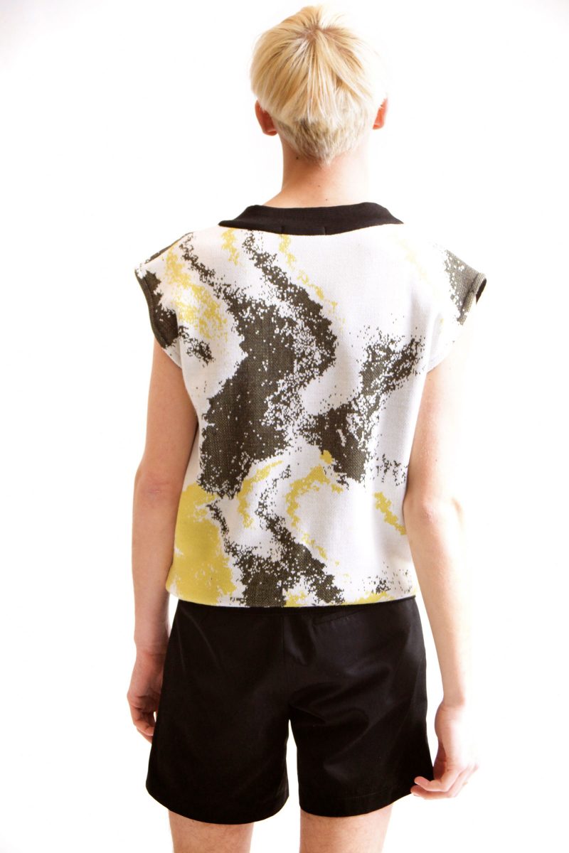 Veste unisexe à motif coloré avec un mélange de jaune citron, de blanc et de noir.