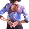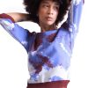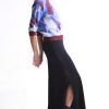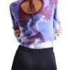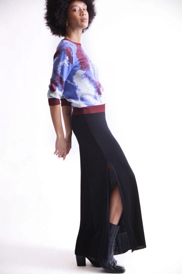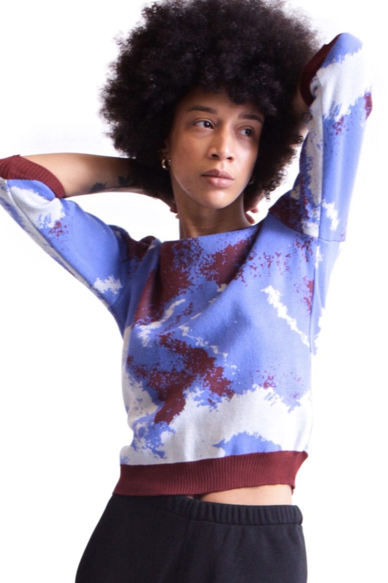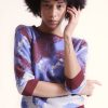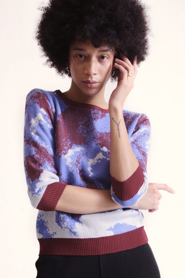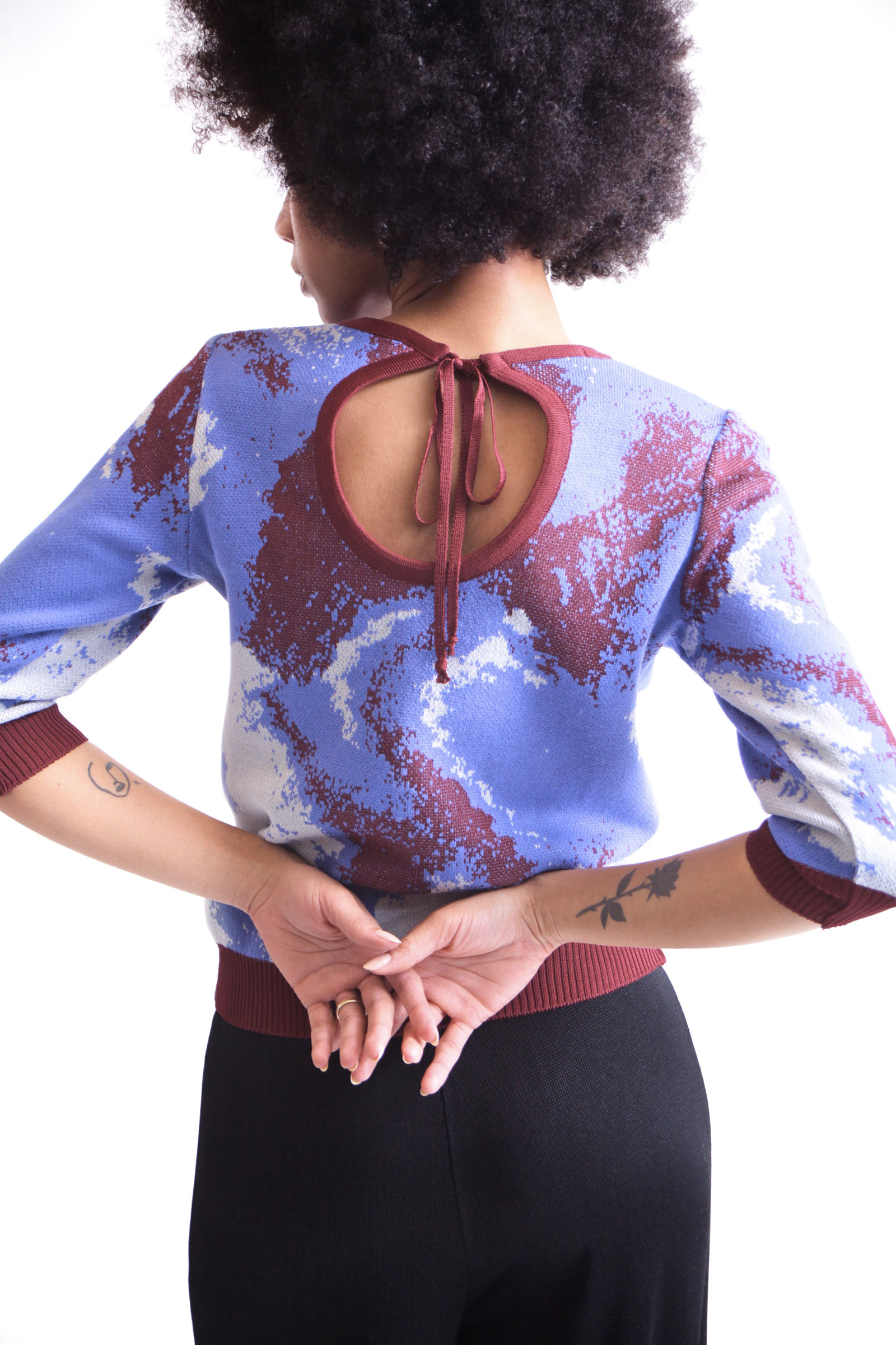 Marble pattern sweater with ¾ sleeves and a circle shaped opening on the back. The colour combo is a mix of eggplant, light grey and violet blue.