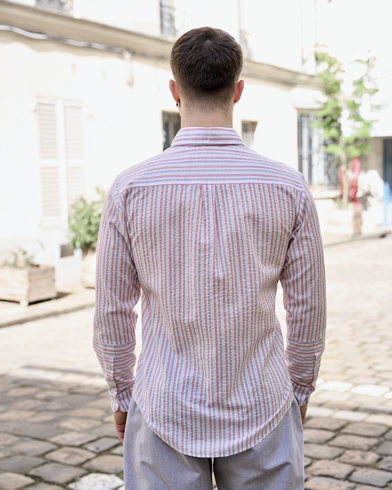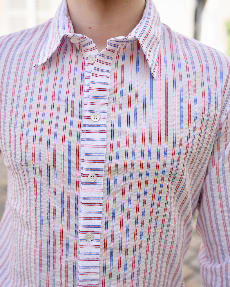 Cut in a timeless silhouette, this shirt is crafted from crisp seersucker cotton with a naturally puckered texture. Fine red and navy stripes are woven into a clean white background, offering a fresh take on a perennial classic. Lightweight and breathable, it’s ideal for effortless, everyday elegance.