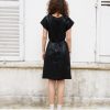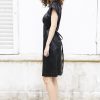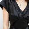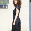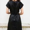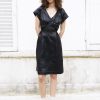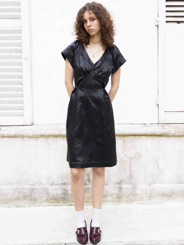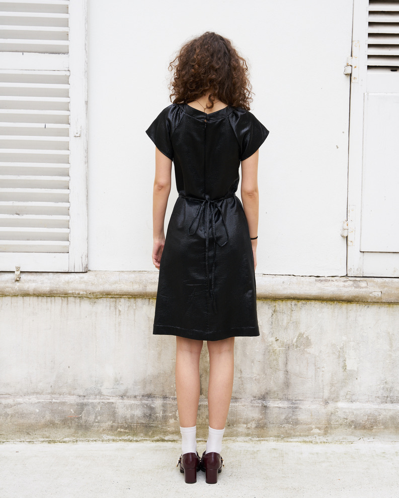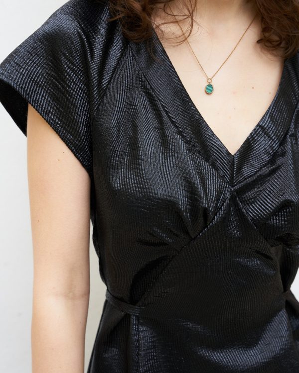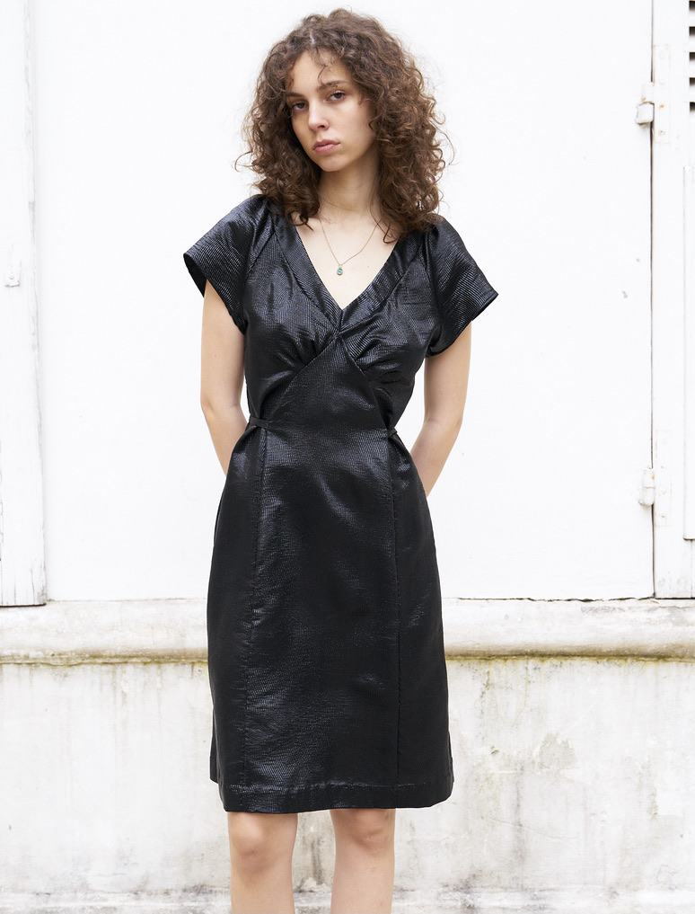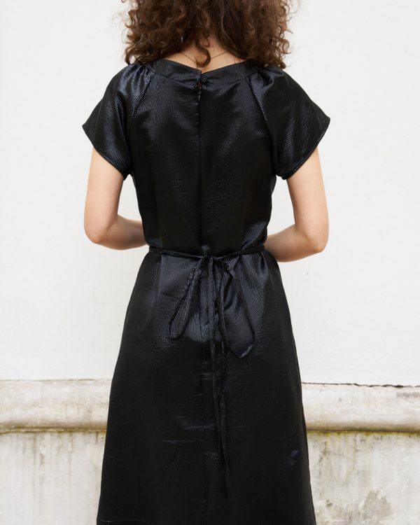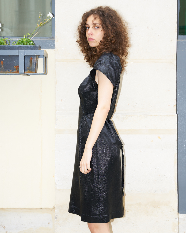 Lamé black dress with deep V neck and bell sleeves, The intricate cut is inspired from 1930s lingerie, The dress has attached belt a highly adjustable belt in the same fabric.