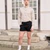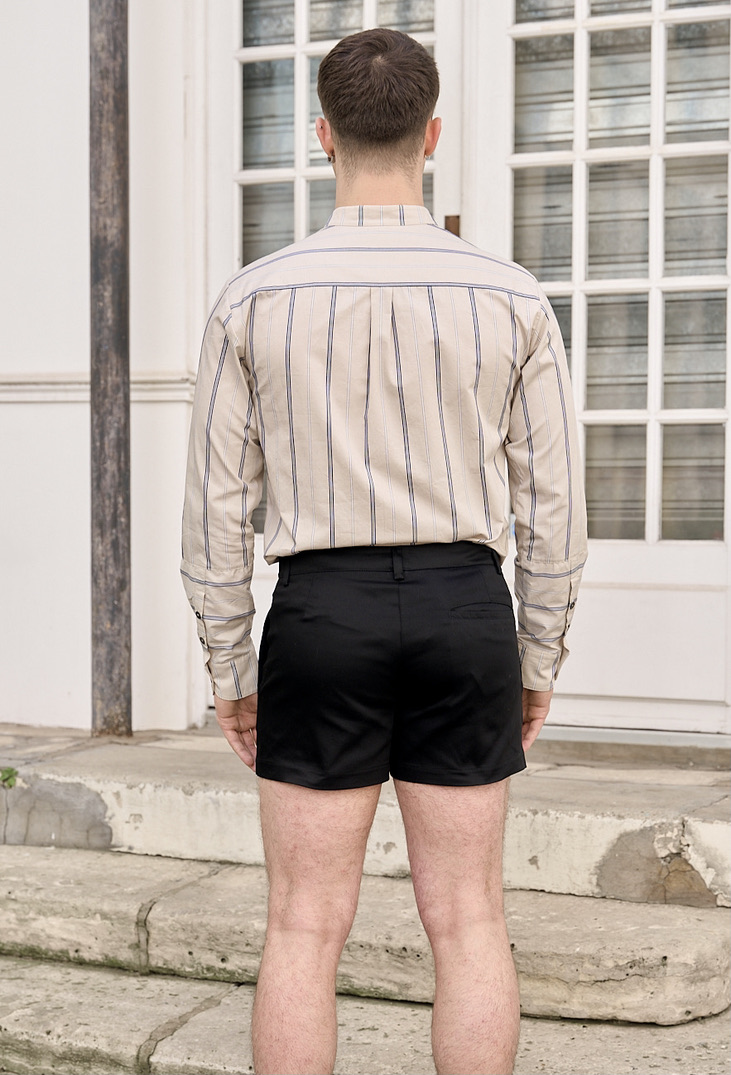 Tailored from crisp, tightly woven cotton poplin, this shirt features a refined mandarin collar and a structured yet breathable feel. Fine white and navy stripes are woven into a warm beige background, offering a modern take on classic shirting with understated elegance