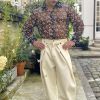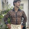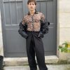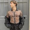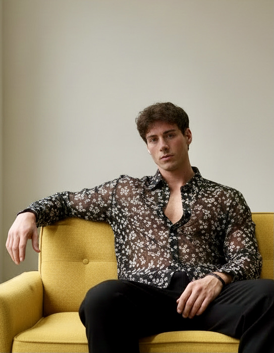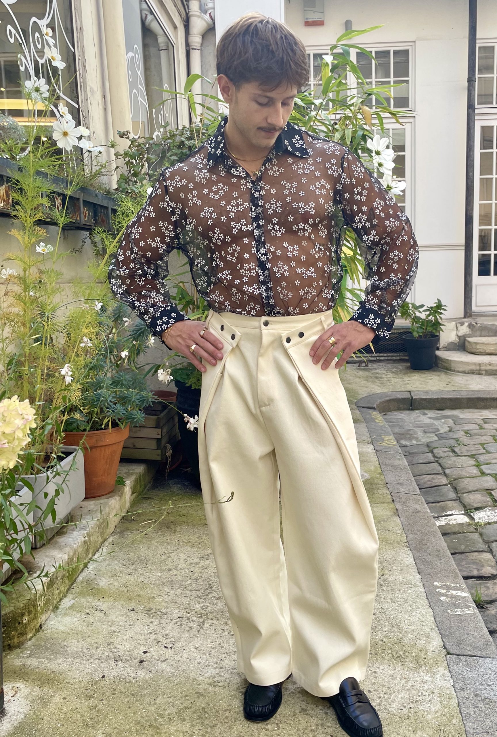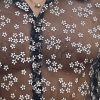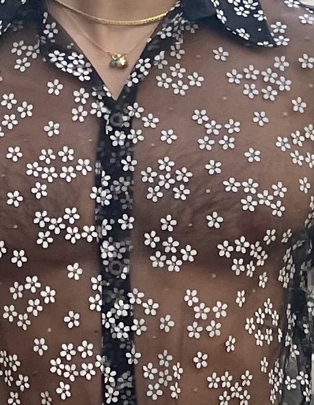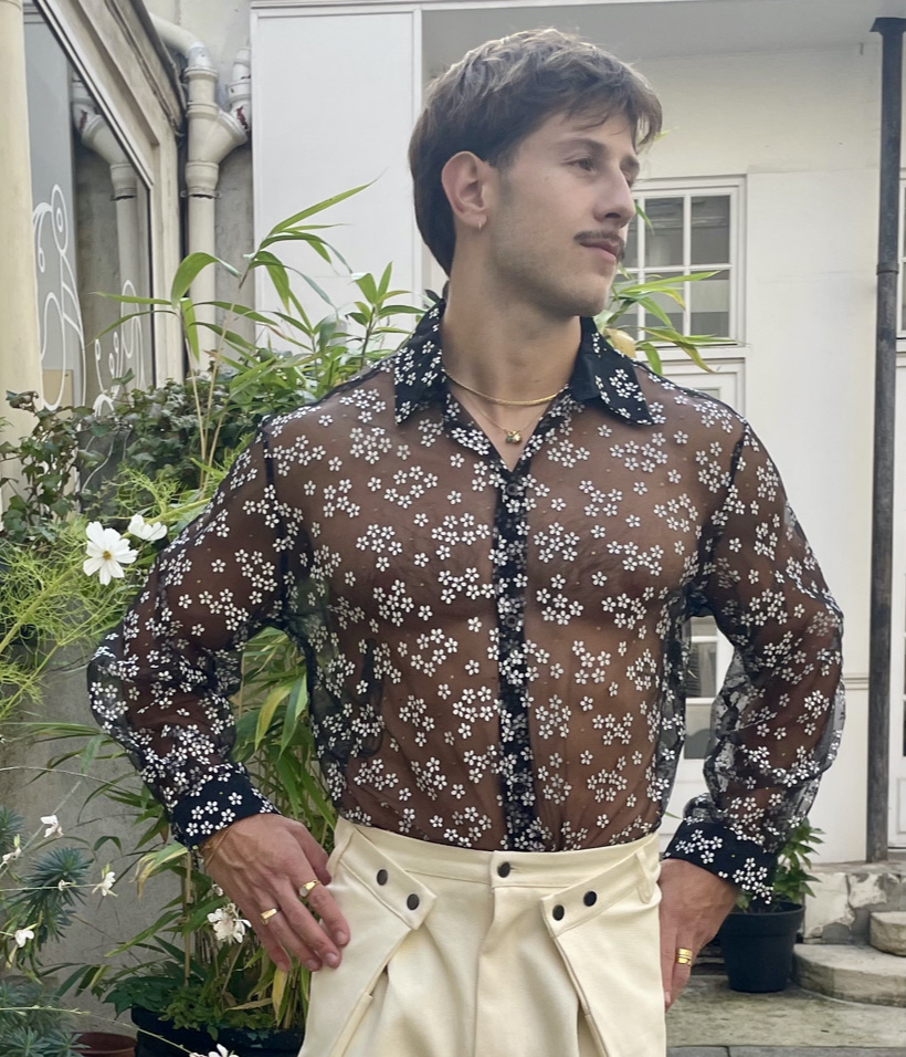 This oversized stretch tulle shirt features a sheer black base patterned with small white and gold flowers, blending delicacy with modern sensuality. The fabric’s slight elasticity gives it a comfortable, body-skimming fit while maintaining fluid drape and transparency. A contrasting floral trim along the collar, placket, and cuffs adds structure and refinement, making it a striking piece that balances romantic detailing with contemporary attitude.