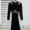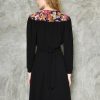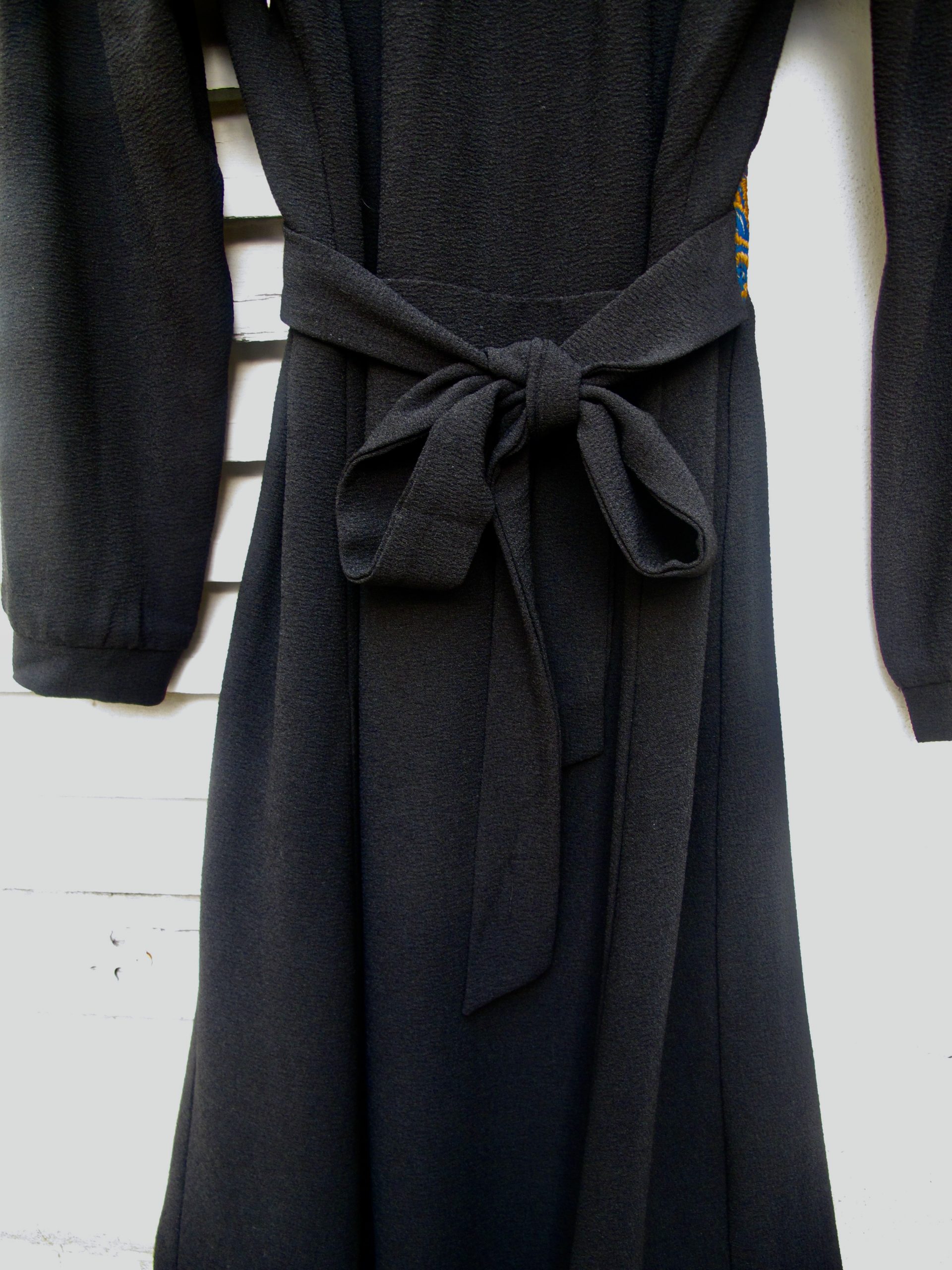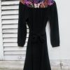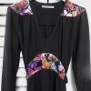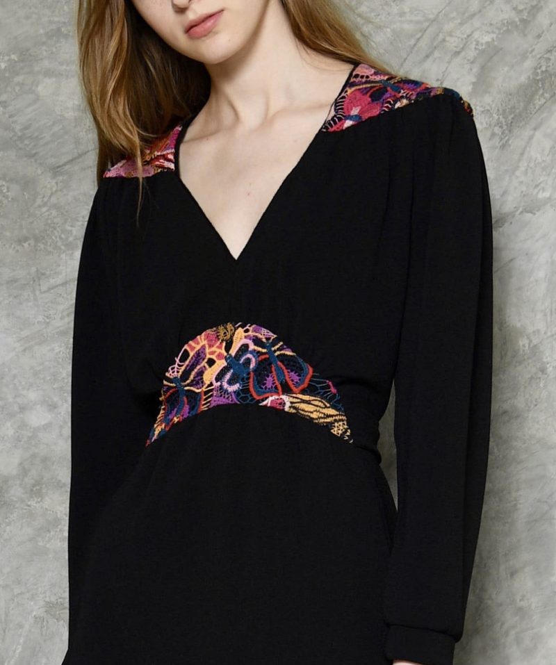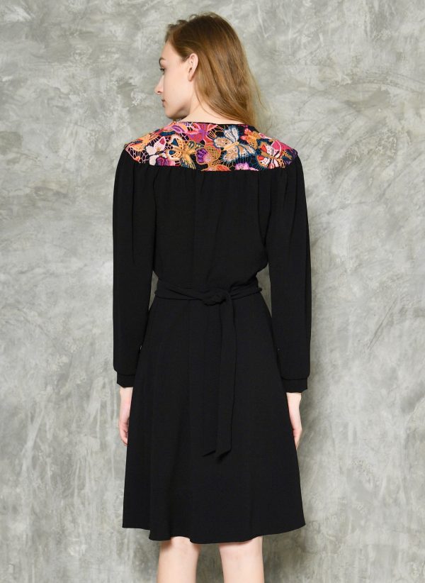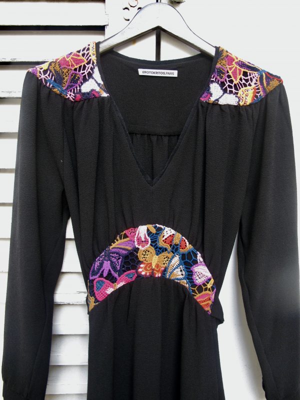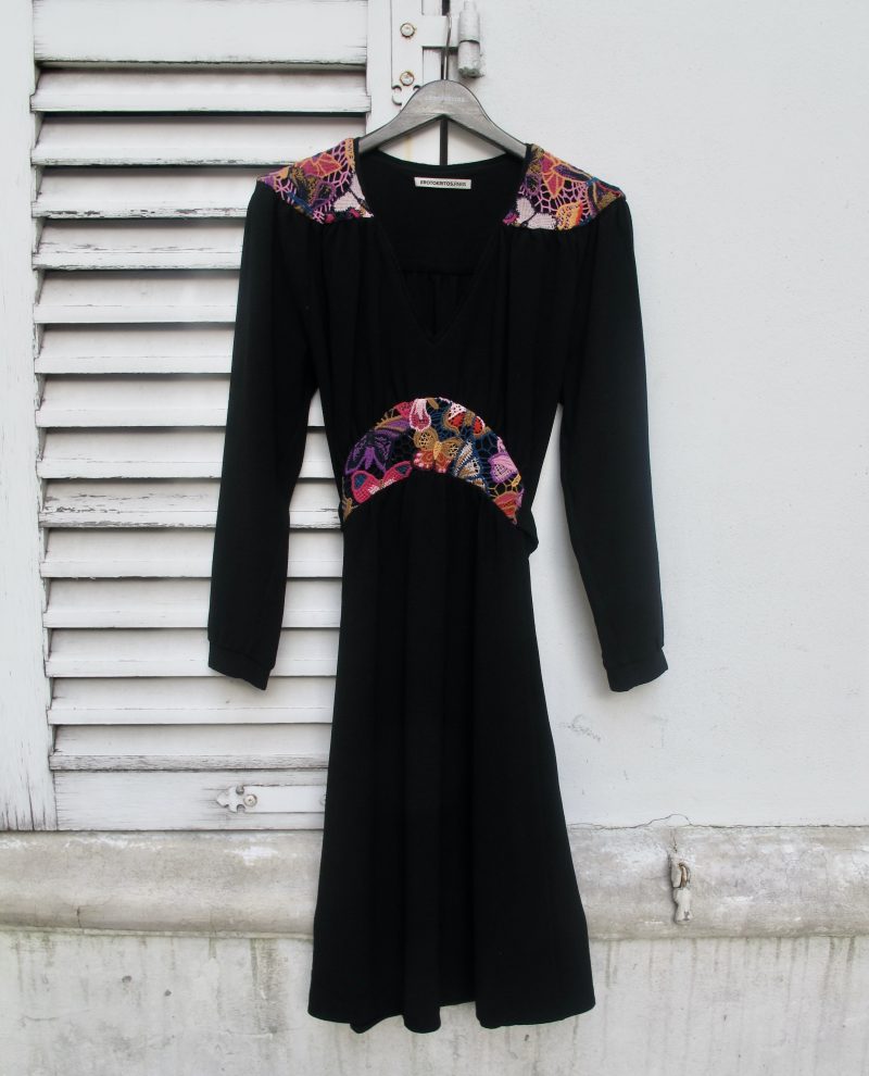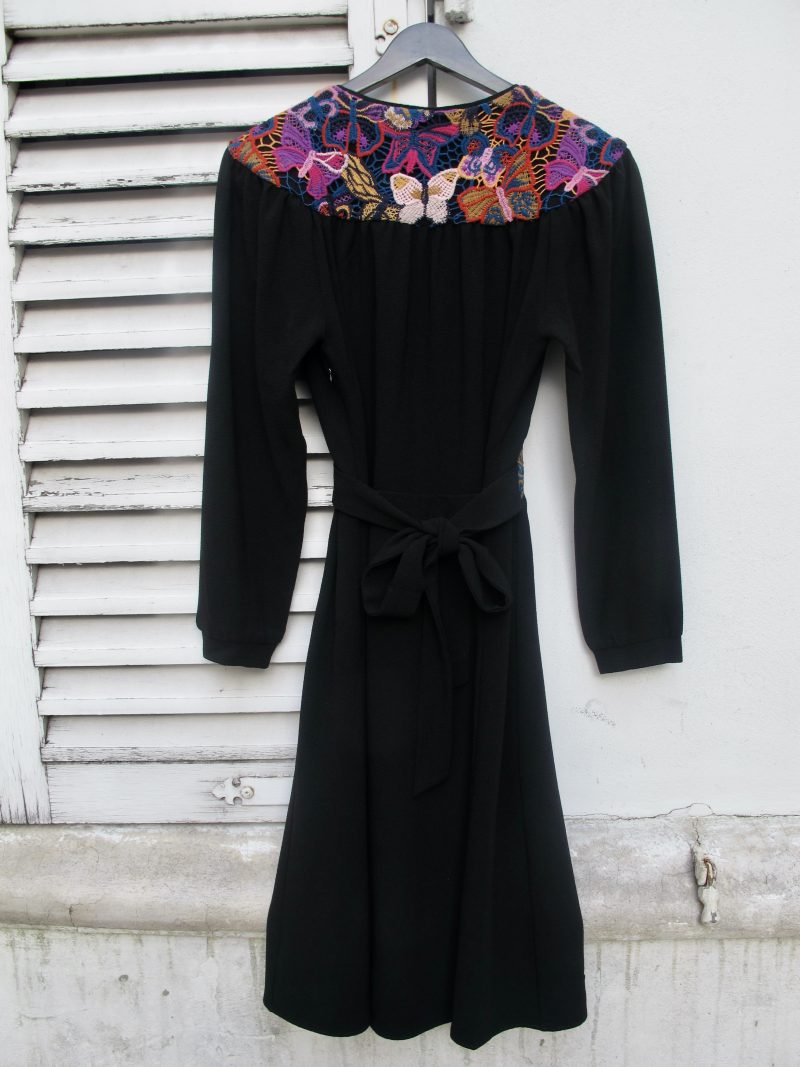 Retro style crepe dress with colorful lace inserts on the waist and shoulders, The cut is inspired from 1940s romantic but well constructed styles.