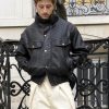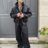 A vegan leather jacket with a sleek, futuristic attitude. The material itself is beautifully textured and substantial — thick yet supple, giving structure and presence to the silhouette. Sculpted shoulders are shaped by a soufflé construction, a subtle pleat that creates the illusion of padding without any bulk. The high collar, elasticated waist, and side pockets enhance its aerodynamic design, while the front closes cleanly with snaps or a zipper. A statement of modern craftsmanship.