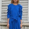 Robe coupe droite à manches raglans plissées. Ceinturée au niveau de la taille de la même matière et boutonnée au dos.
