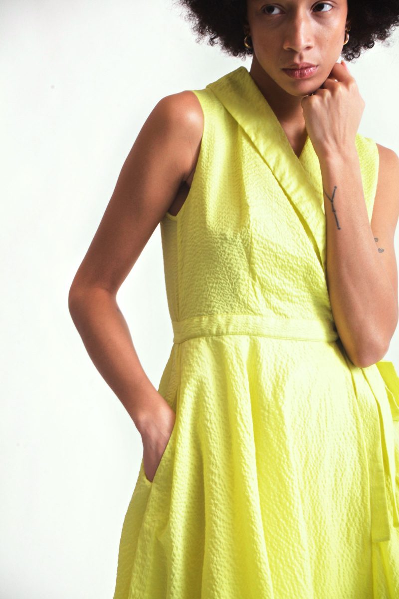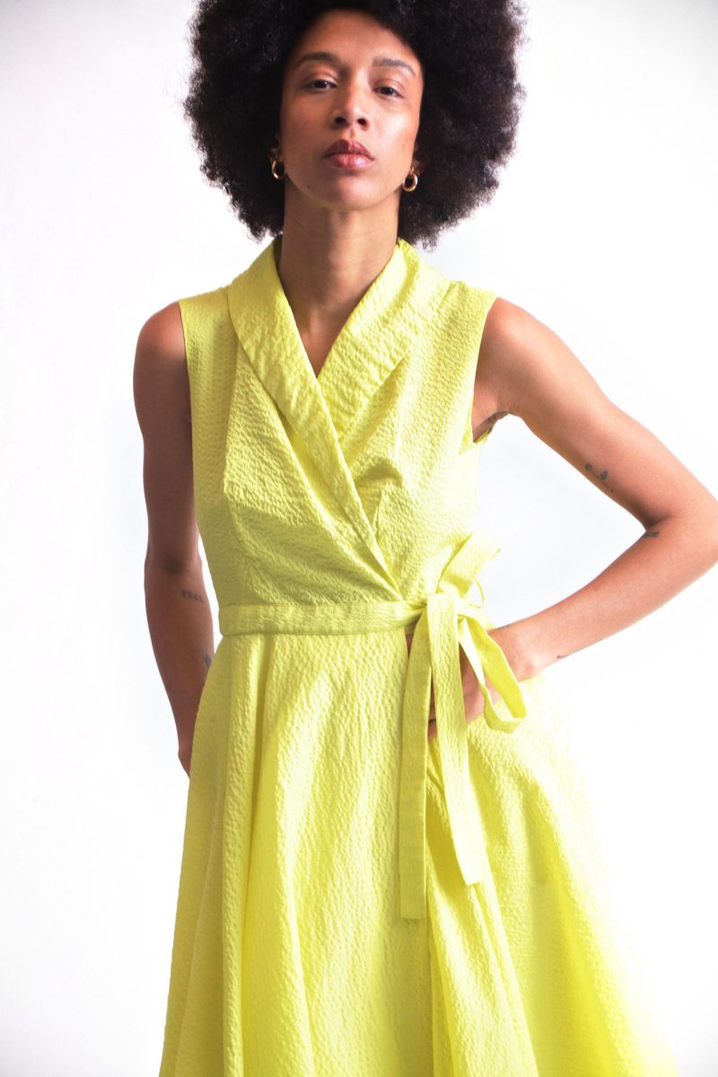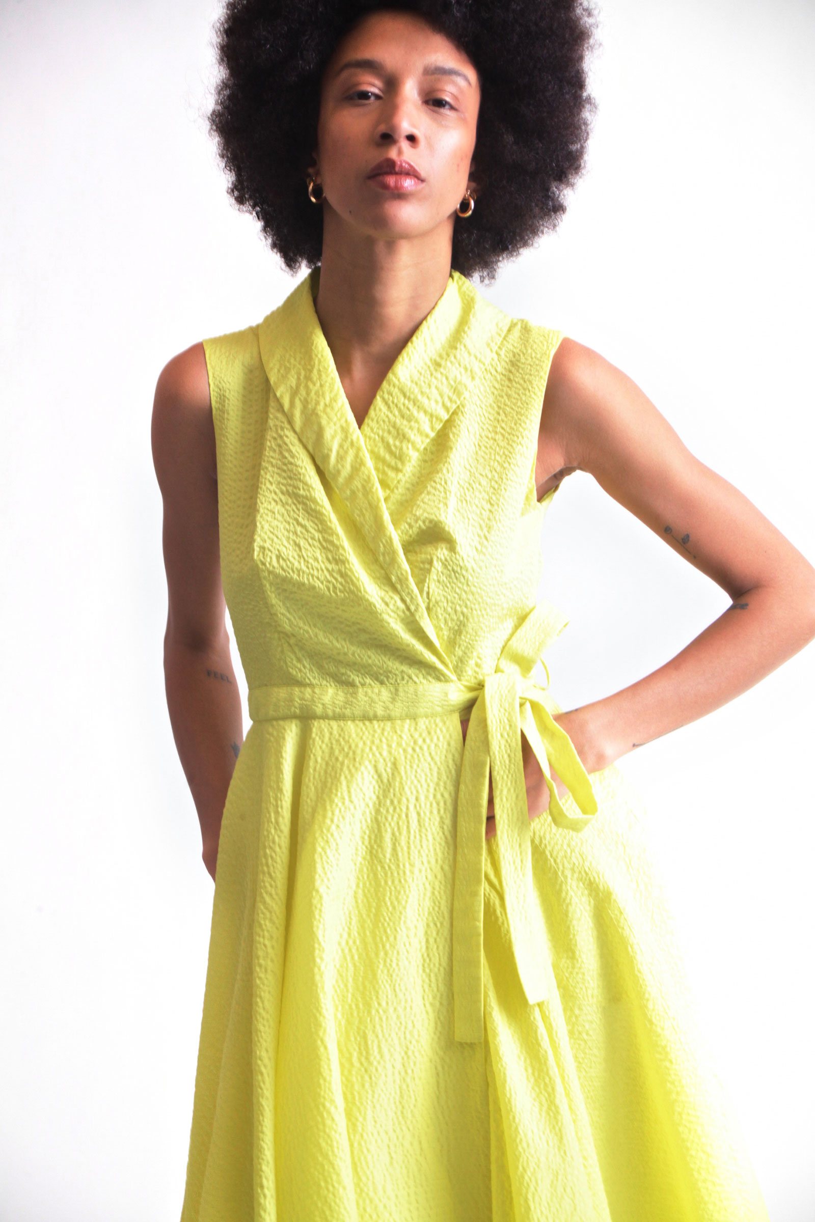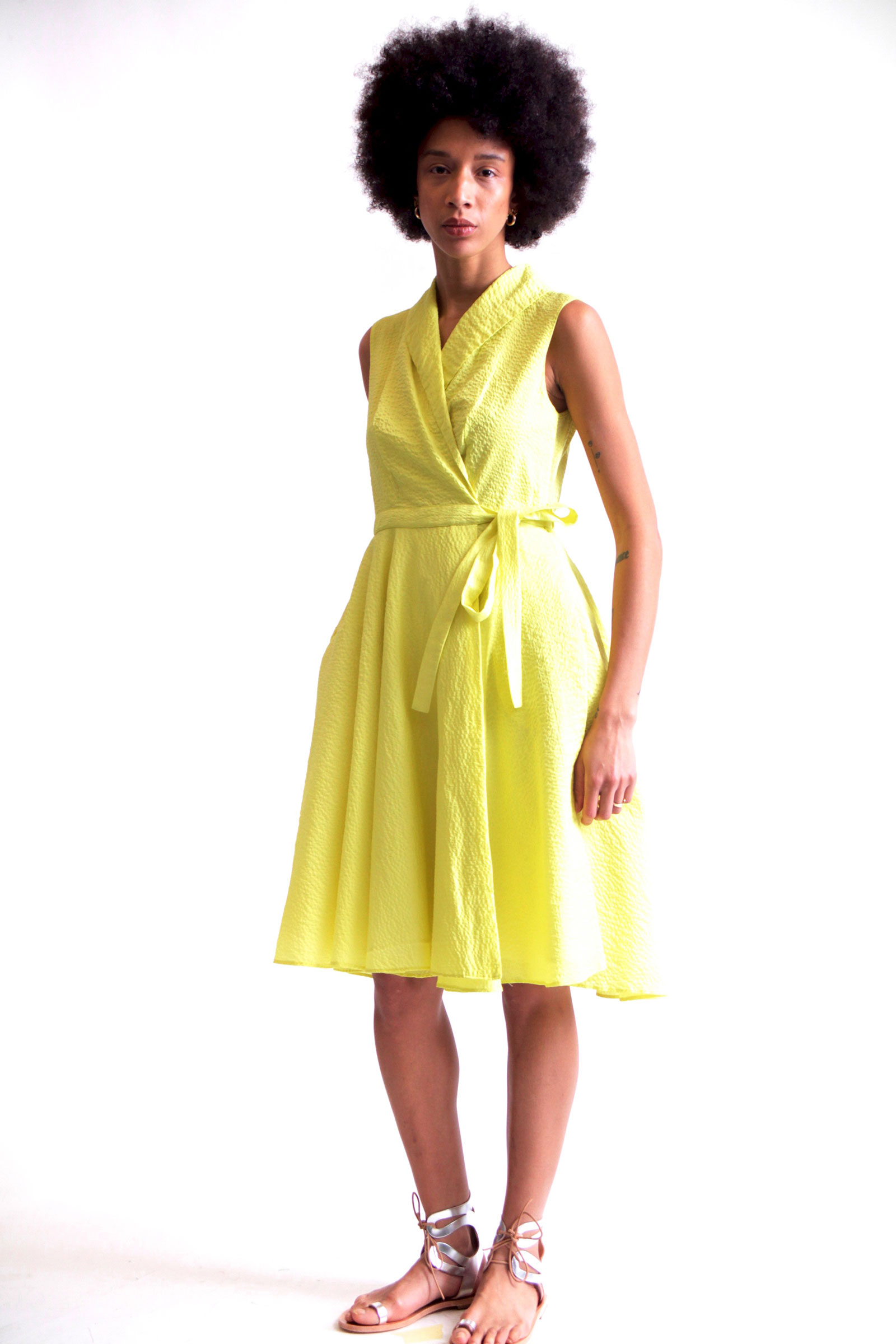 Robe portefeuille en seersucker de coton couleur jaune citron. Elle possède une jupe plein soleil à poches et ceinture de la même matière.La robe est entièrement doublé.
