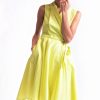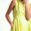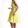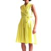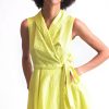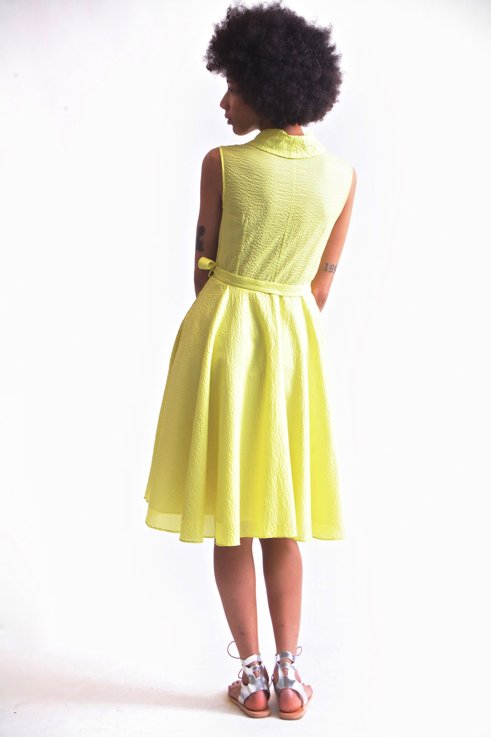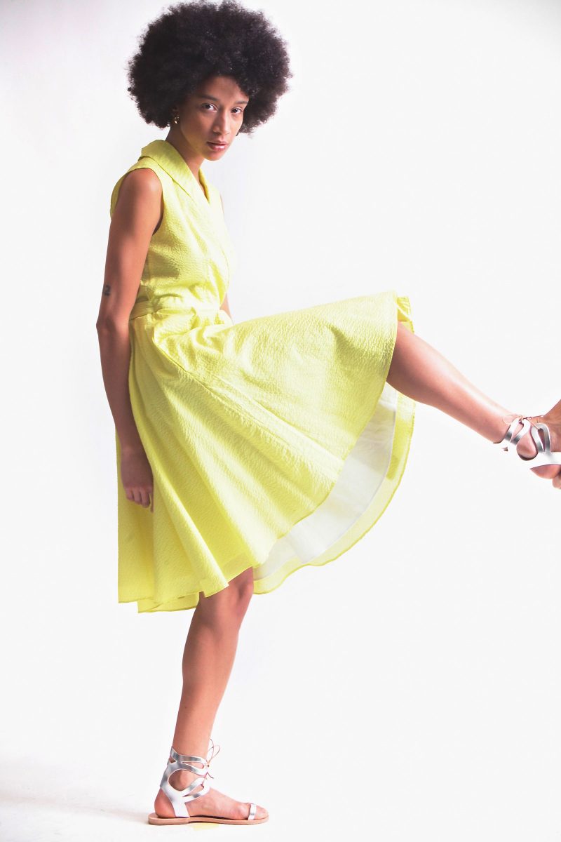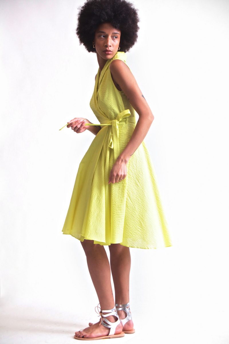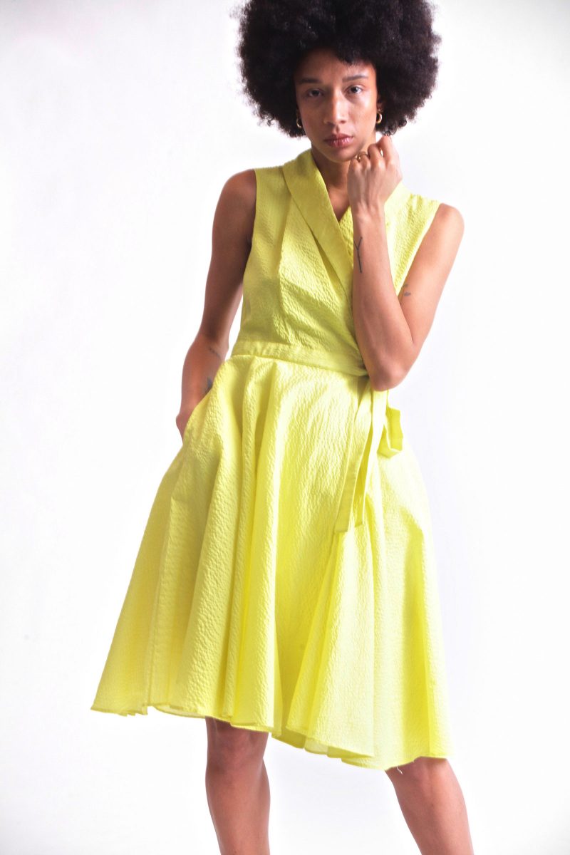 Robe portefeuille en seersucker de coton couleur jaune citron. Elle possède une jupe plein soleil à poches et ceinture de la même matière.La robe est entièrement doublé.
