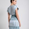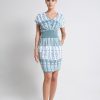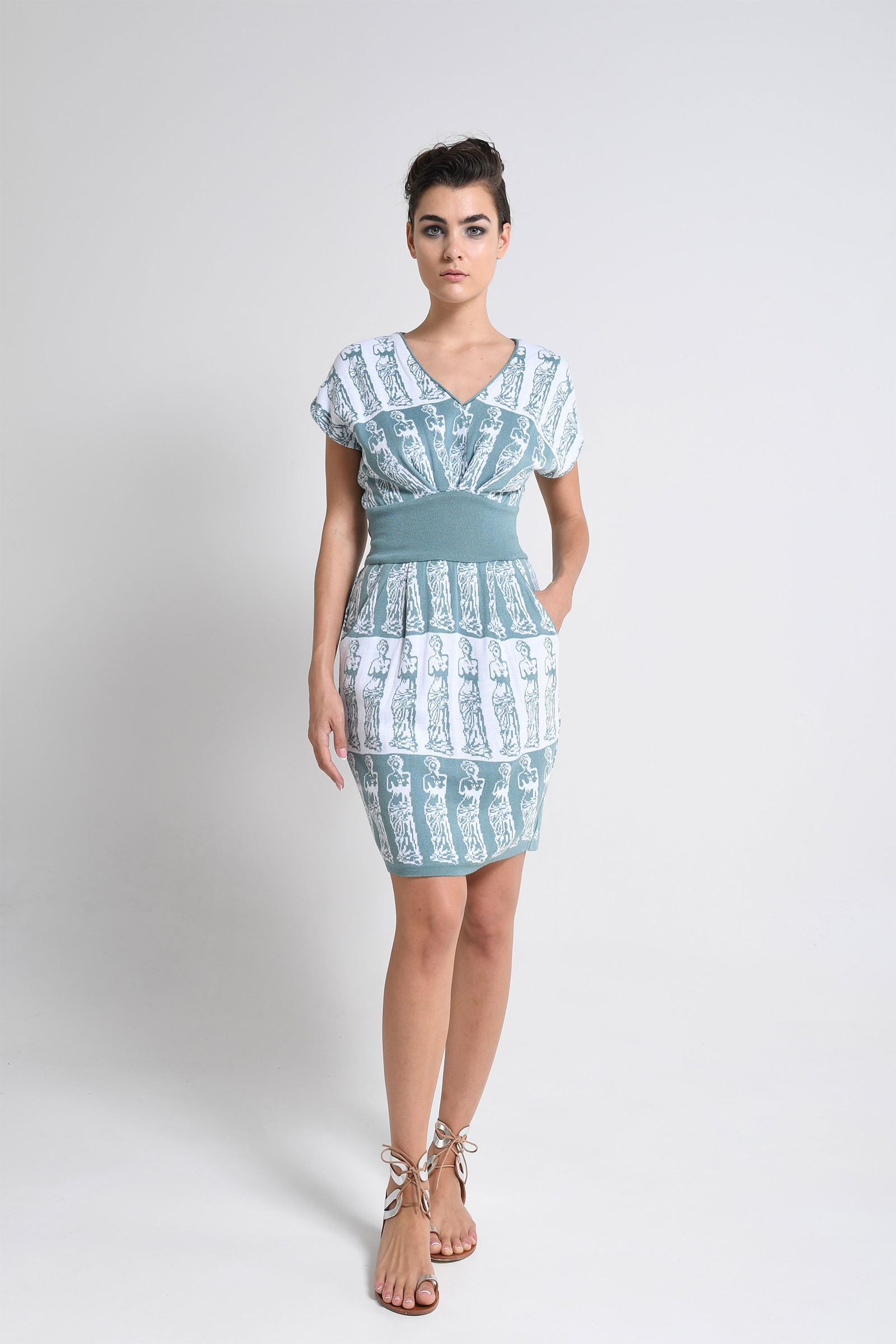 Robe en maille à poches motif aphrodite de milos. Manches tombantes ajustable avec bouton et découpe ajourée au dos.
