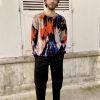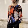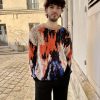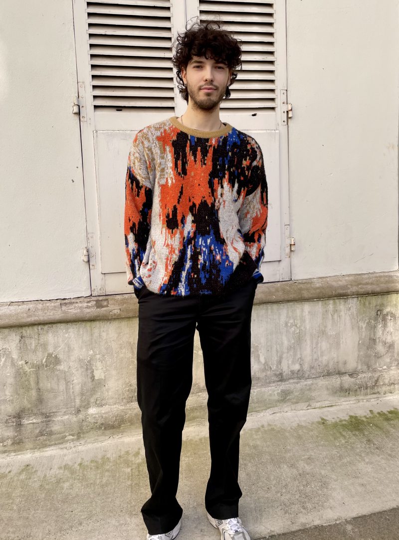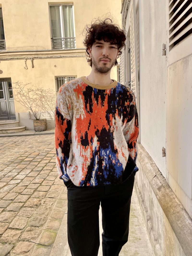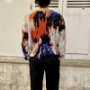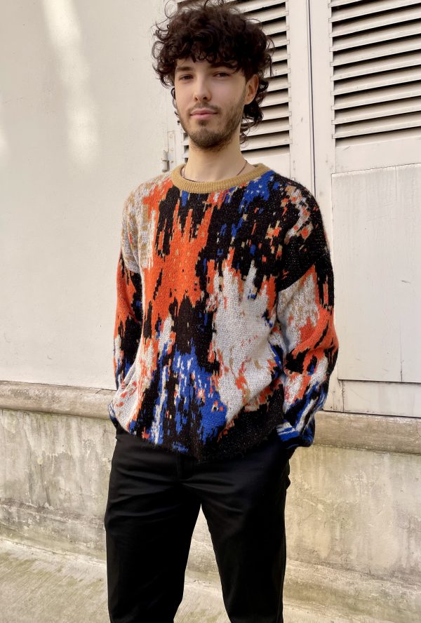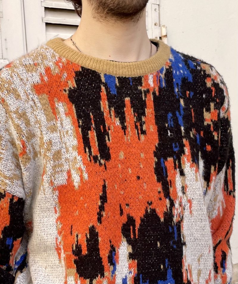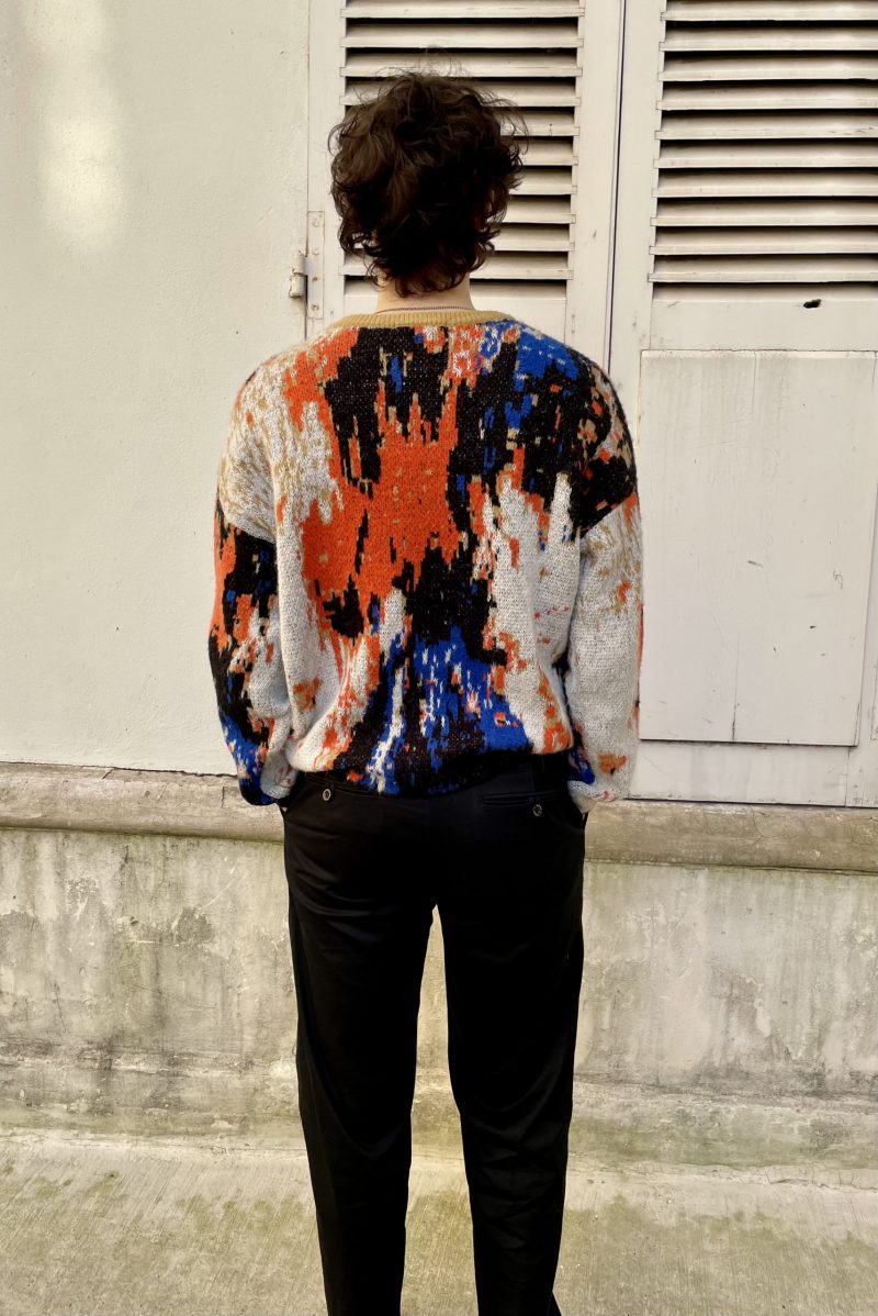 Oversize abstract knitted multicolor jacquard sweater. It has a relaxed round neck and drop shoulder cut.Â