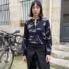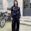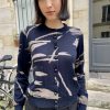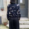 A short, round-neck cardigan crafted in a soft night blue and warm beige jacquard knit with a paintbrush-inspired pattern. It features multiple small, round ball buttons along the front — a playful, tactile detail that adds charm to its classic silhouette. The piece has long sleeves, a slightly cropped length, and a fitted shape, balancing a vintage sensibility with a modern attitude.