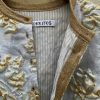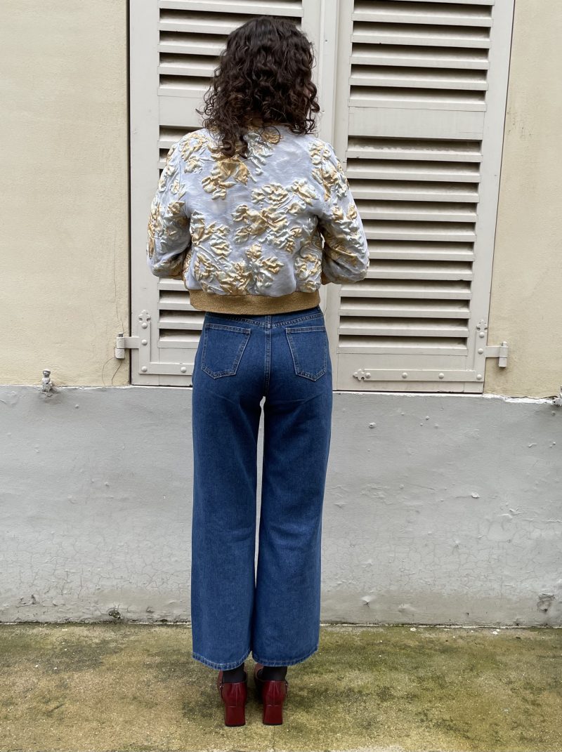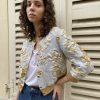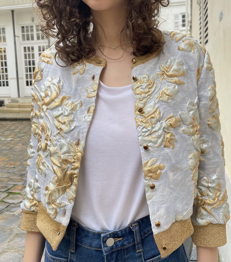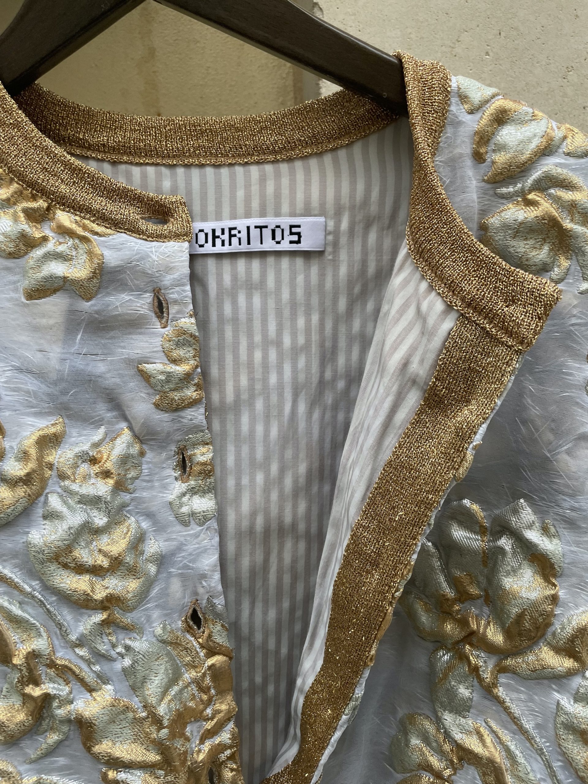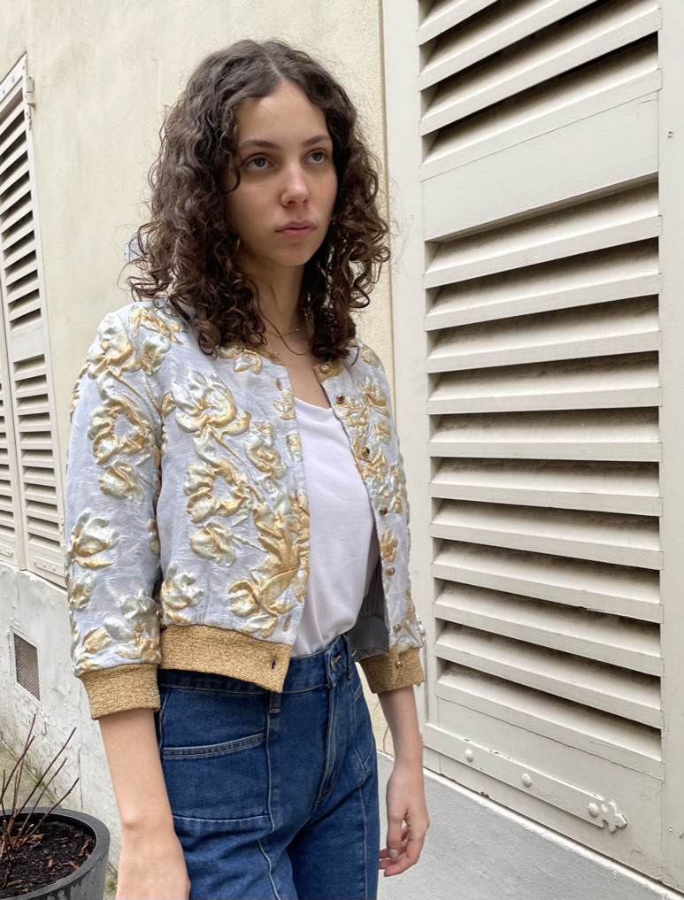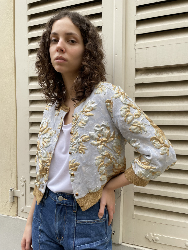 Gold and silver floral brocade crop jacket lined with silk stripe lining and finished with gold Lurex ribbing, the buttons are hand made glass.