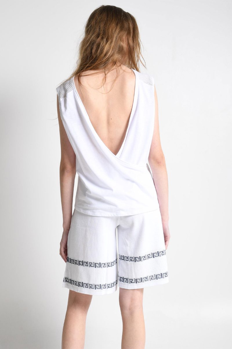 Short en maille fine avec bordure de motifs méandre irisée et taille élastiquée.