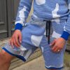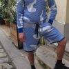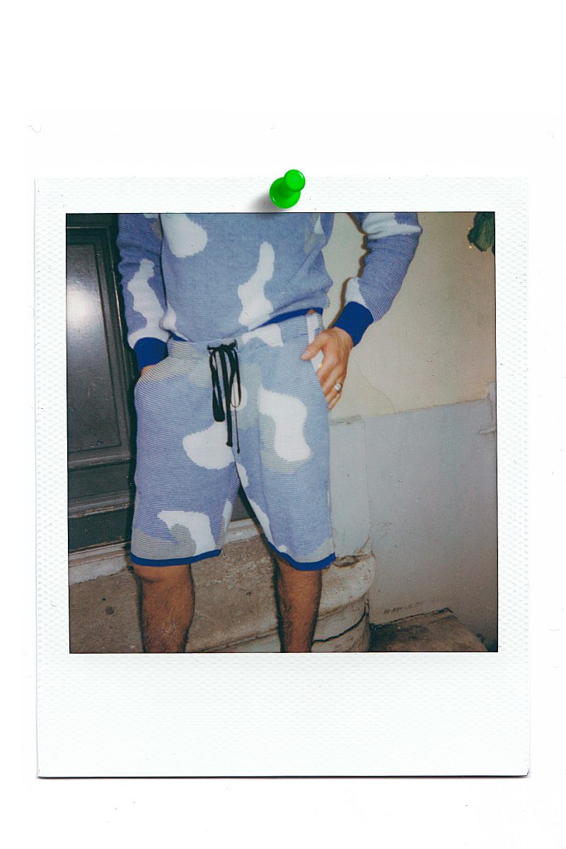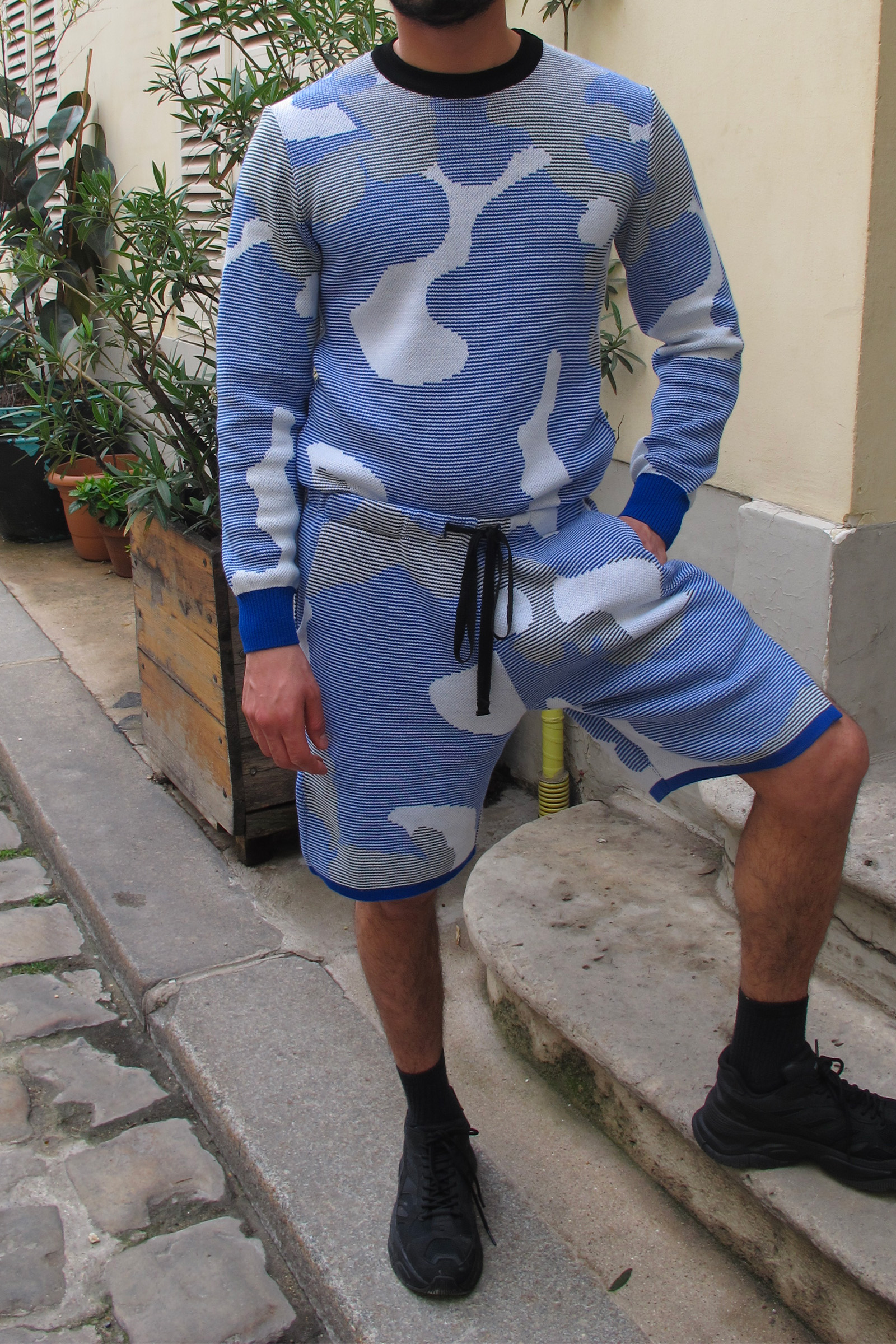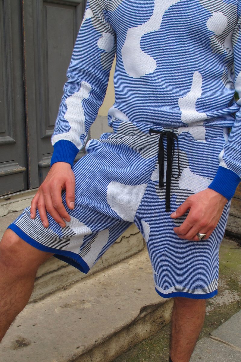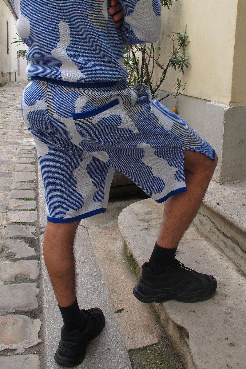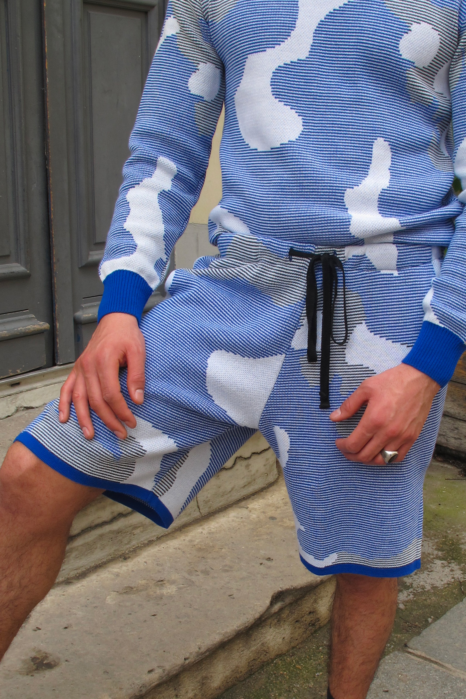 Bermuda short en maille motif abstrait fendu sur les côtés. Le short possède des poches et une taille élastique réglable avec un ruban en maille.