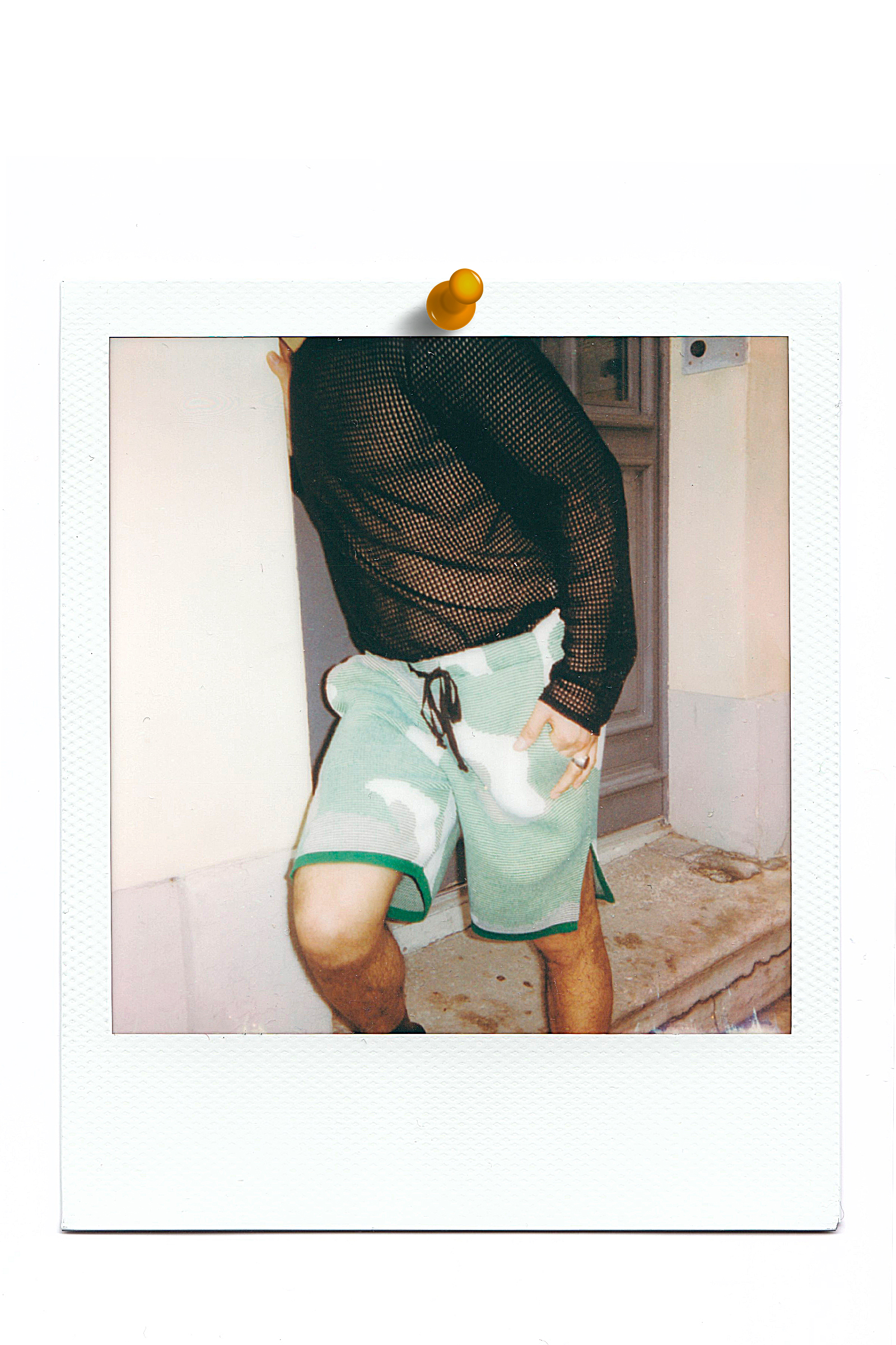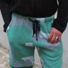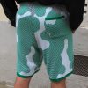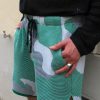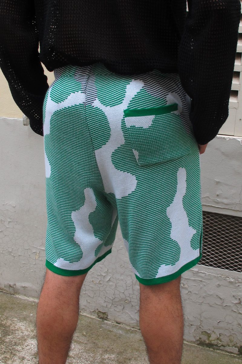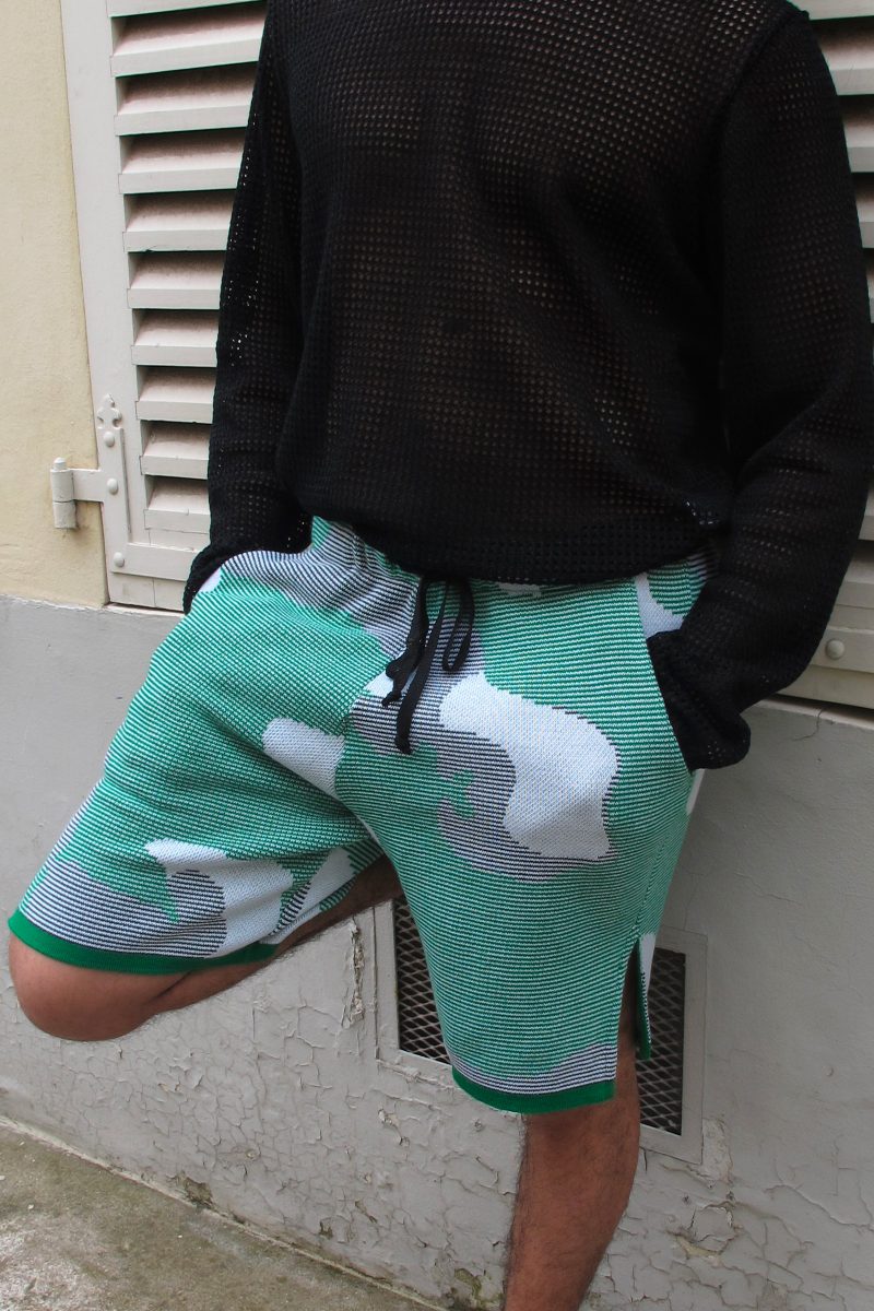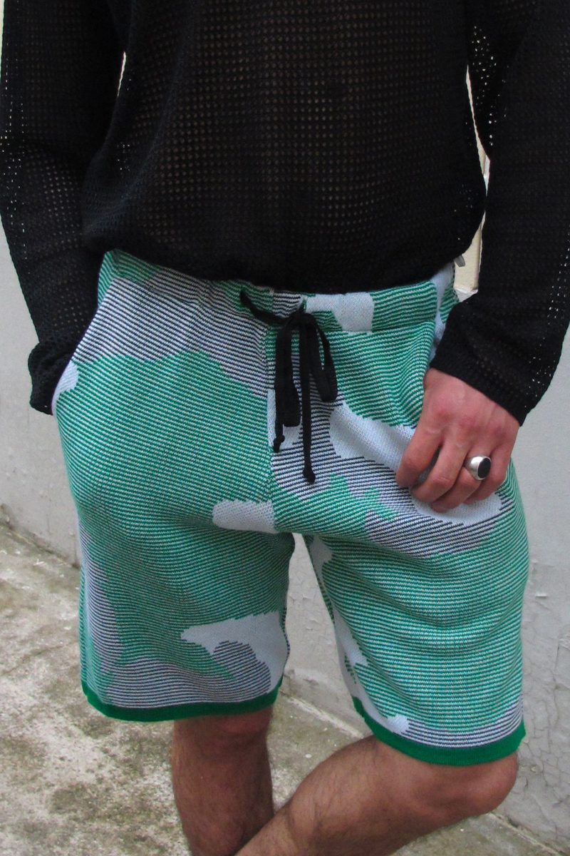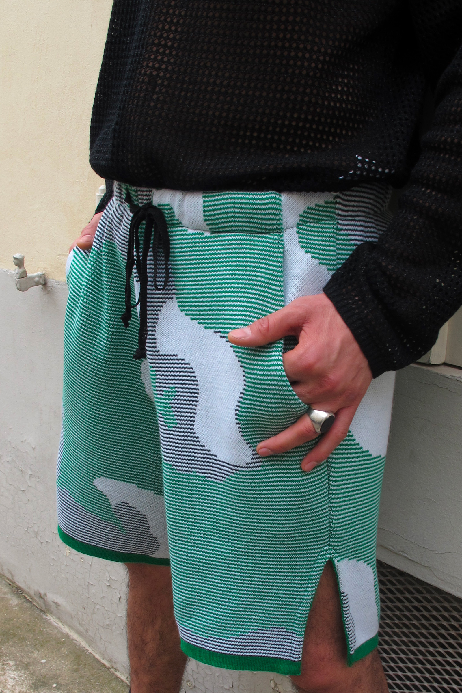 Bermuda short en maille motif abstrait fendu sur les côtés. Le short possède des poches et une taille élastique réglable avec un ruban en maille.