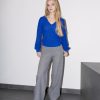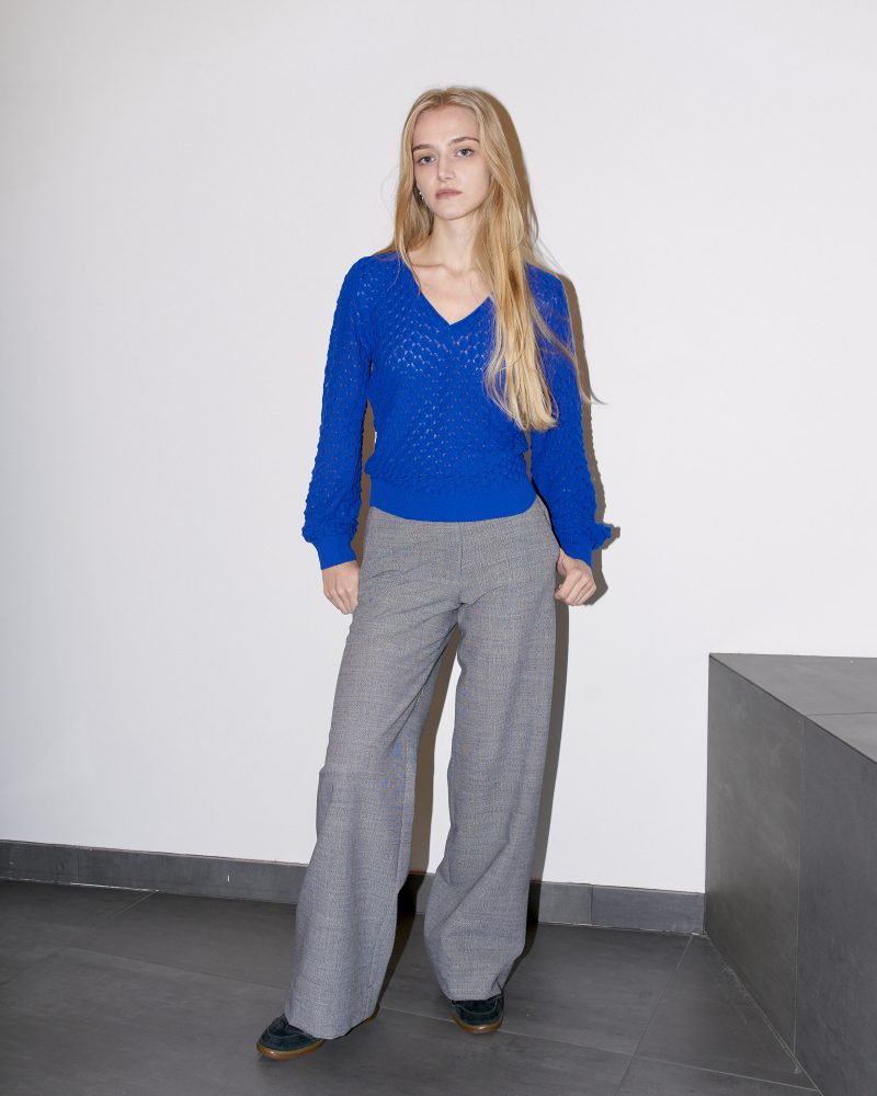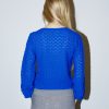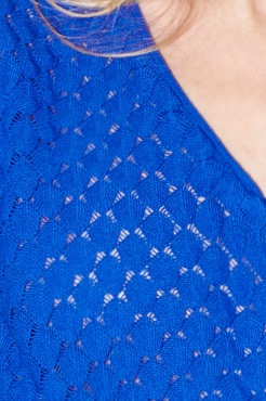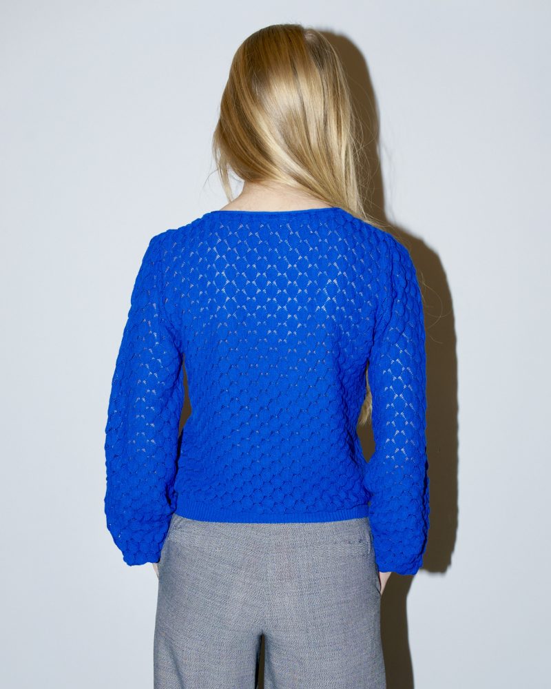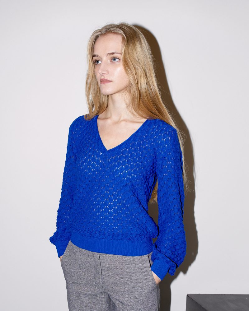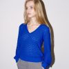 Fine textured Lace Knit V neck sweater with balloon sleeves.