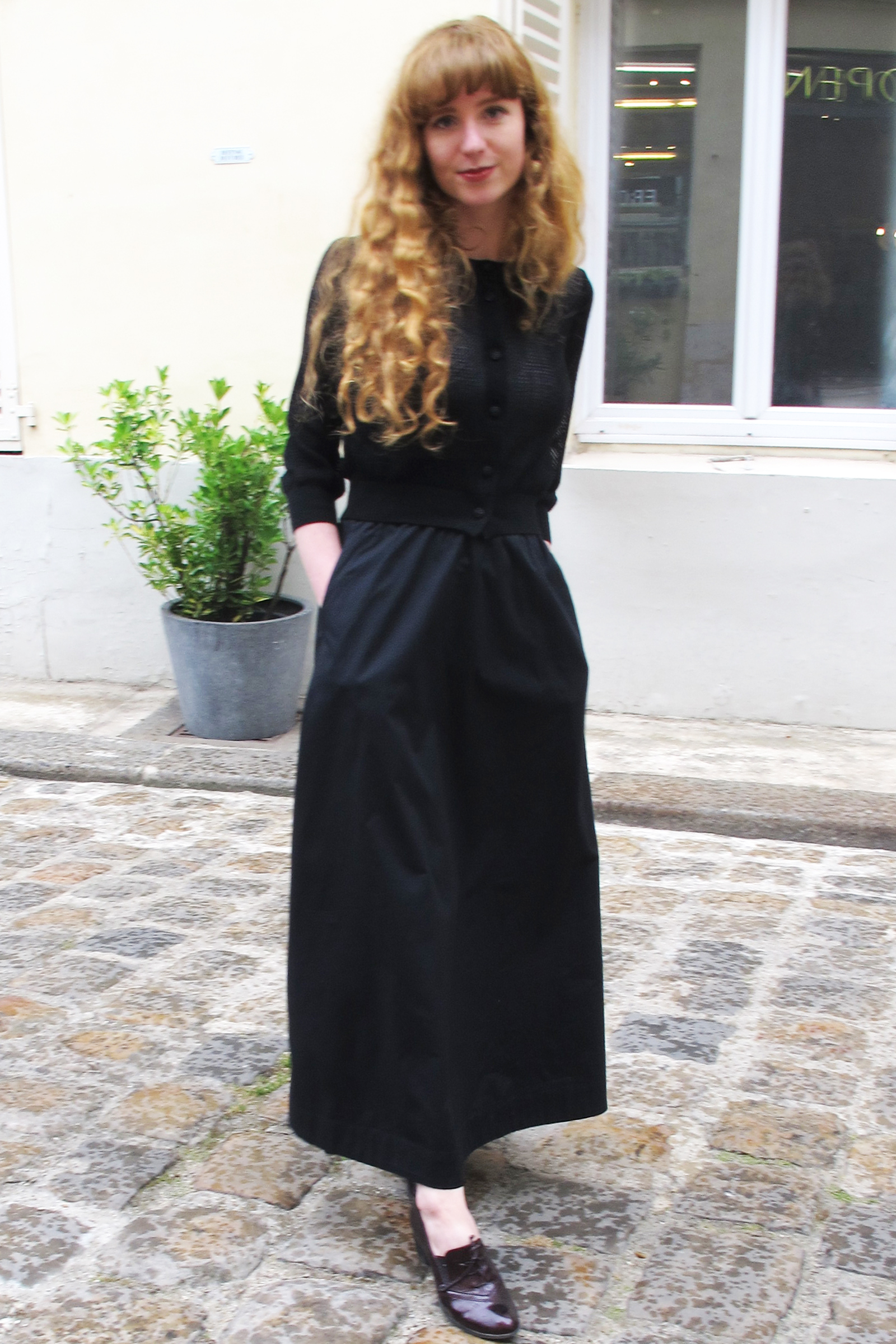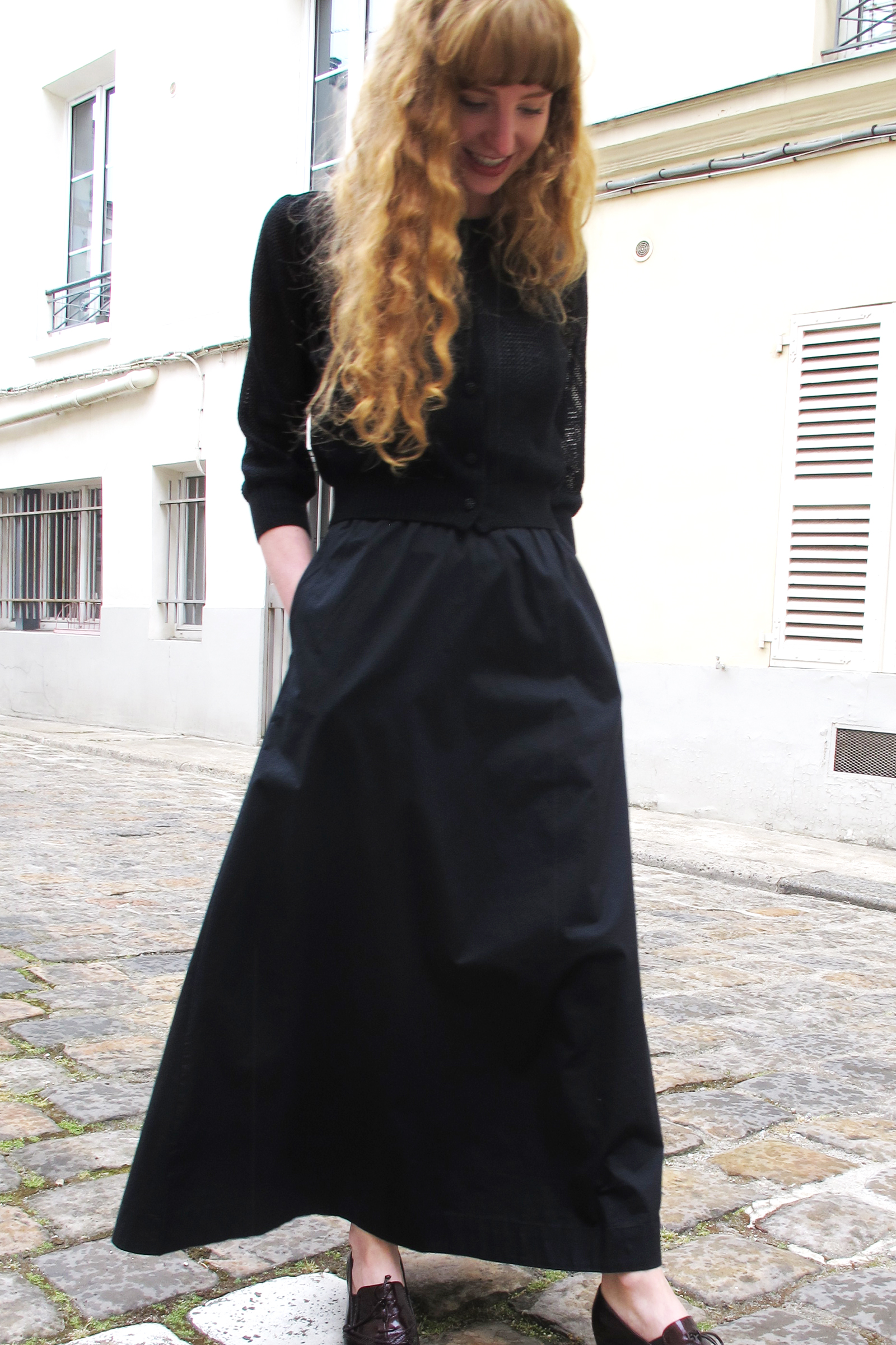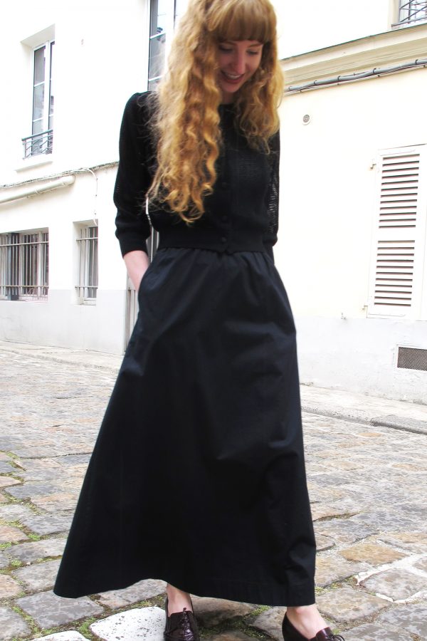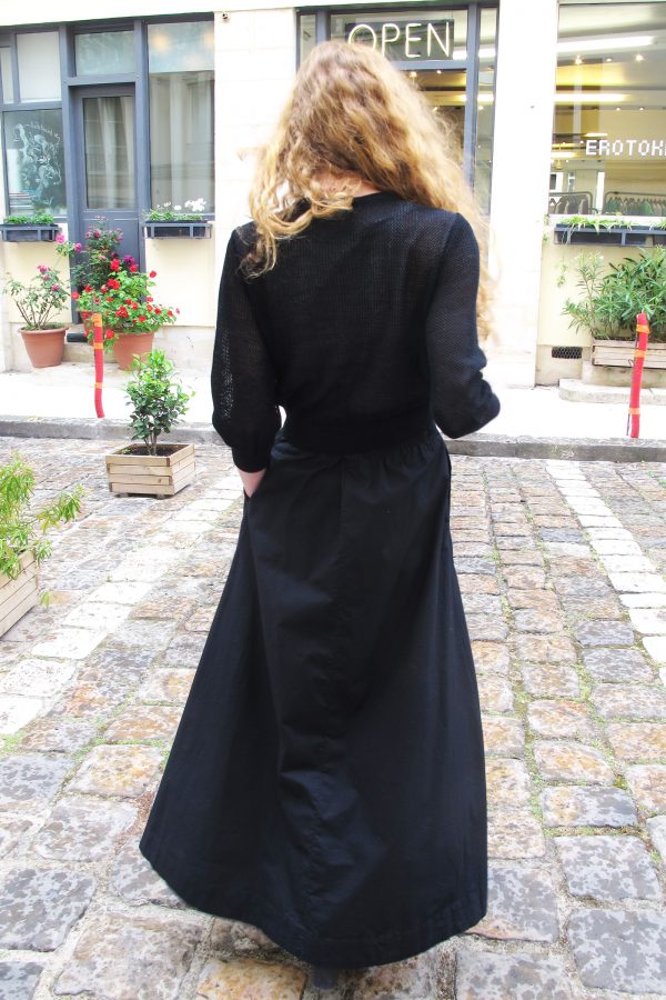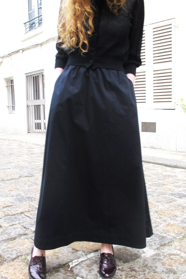 High waist A line long skirt with pockets and elastic belt which makes the style very size flexible. The large hem gives a structure to the elegant shape.